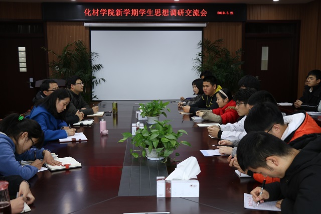 于3月21日下午四点半在理科大楼702室召开了新学期学生思想调研交流会。院党委书记汪俊武、党委副书记余妍霞、副院长张小俊及20余名学生代表参加了此次会议。