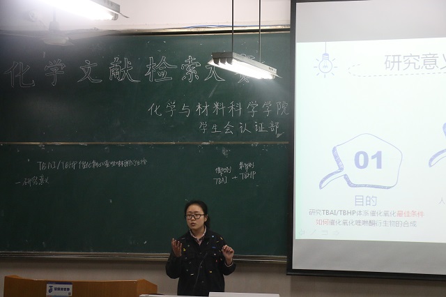 崔明玉、王菲)化材学子,佼佼尚学,鸾翔凤集。为帮助我院学子掌握文献检索的方法,进一步提升化材学子的基本素养,我院于4月14日晚在行知楼2030103举办了化学文献检索大赛。我院李一梅老师、王银玲老师、卓淑娟老师、蒋建伟老师莅临比赛现场。在之前比赛中脱颖而出的九组选手成竹在胸,尽显风发意气。