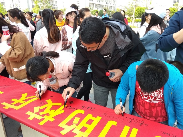 终点处,经过短暂的休整,参游师生纷纷在活动主题横幅上签名,为母校90岁生日献上了诚挚的祝福。随后,绿帽奴