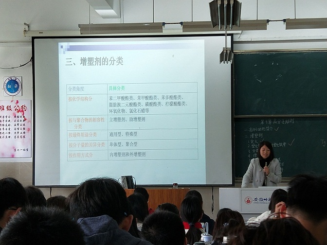 在教学中,王老师通过分类举例,将不同性质的增塑剂娓娓道来,简洁精练,声像并茂;对增塑剂的功能,分类,俗名等内容的解说全面详尽、深入浅出。整个课堂教学围绕增塑剂这一主线,理论与案例充分结合,重难点讲解详细透彻,教学组织行云流水。课堂上,师生互动频繁、课堂气氛活跃。听课老师们纷纷赞同这是一堂师生共促、师生共学、师生共进的生动有趣的理论教学观摩课。