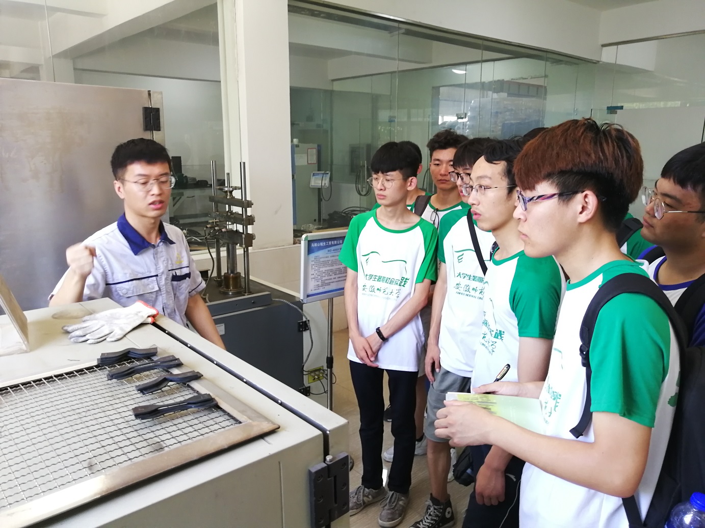 马鞍山安徽锐生工贸有限公司是一家全国橡胶专业化生产的龙头公司,参与了全国对于橡胶产业的十项标准的制定与修改。学生参观见习时,锐生工贸副总何振铿和技术总监胡主任带领团队进入生产车间和实验室进行的观察和调研。在参观厂房时,队员在何副总的详细介绍下,了解到传送带产品包括混炼、裁剪、包裹等的复杂工生产全流程。胡主任从动态物理性质以及橡胶本身化学性质向队员们解释了车间产品检验的原理,让实践队员们对此有了更加充分的理解和认识。在交流访谈过程中,何副总强调公司未来发展将对环保产品的开发和车间生产进行严格的把控,何总说“做事情要有工匠精神,唯有精益求精,才能学有所成”,让队员都获益匪浅。