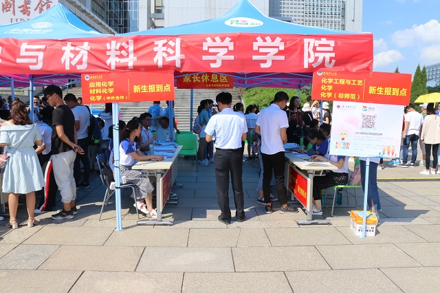 “细节决定成败”,“前进后出”的服务台设计畅通了报名通道;“多步合一”的材料袋设计确保了发放效率;“家长休息区”、“绿色通道”、“爱心送货”等设计提供了全面服务……化材人将严谨、细致的工作作风贯穿了迎新的每一个细节。