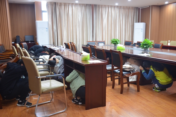 下午2点30分大楼外地震警报器拉响,二楼以上同学就近抱头躲避在桌下或其它坚固的三角位置进行躲避。2点35分大楼外燃起烟幕弹室内火情警报器拉响,同学们用湿毛巾或纸巾捂住口鼻在老师带领下顺着大楼安全通道弯腰低行有序疏散至大楼外。在演练过程中楼内疏散人员能服从指挥按照预先的消防疏散路线疏散学生和实施防震避险,确保证学生安全有序疏散至大楼外,疏散出大楼后同学们集中到物电绿帽奴