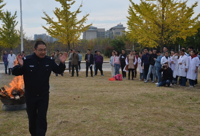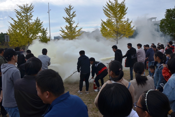 大门外南面空场处进行手持灭火器现场使用讲解及灭火演习,校保卫处处长结合现场燃起的火堆细致讲了解灭火器的使用方法,并让同学们亲自体验了一次灭火器扑灭明火的实战。