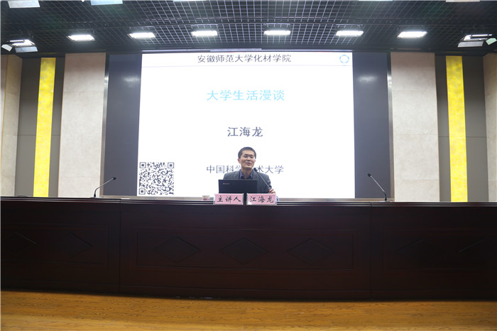 度过的美好大学时光,通过自己在大学的成长经历,从“中学与大学的不同、大学学习生活建议、教育的使命”等方面来讲述他对当代大学生活的看法。他认为,中学老师“逼”着学生走,大学学生“追”着老师走,大学生要有“打破沙锅问到底”的精神;中学是封闭式教育,大学是开放式教育,中学伏案学习,大学应站起来四处观望。他强调大学需要自主学习和成长,优秀的大学生会主动为自己定下学习目标,善于开动脑筋,并且知道学习为着什么。作为优秀的学长,江海龙结合自己的经验,提出了对大学生活的建议。他从“我们来大学做什么?毕业后我们要做怎样的人?”这两个问题切入,勉励学生们要掌握独立生活、时间管理、财政管理、应对挫折等方面的能力,要确立目标,学习做人、做事、与人相处。在讲座的最后,江教授点明了教育的使命,指出当代大学生不应功利化读书,不以找工作为唯一目标,做到凡事有交代,件件有着落,正确认识自己,脚踏实地,通过勤奋刻苦来实现自己的目标。两个多小时的讲座中,江教授结合自己亲身经历,以自己丰富的经验,用生动风趣的语言,为化材学子提供了许多宝贵的建议,精彩的演讲赢得了全场经久不息的掌声。