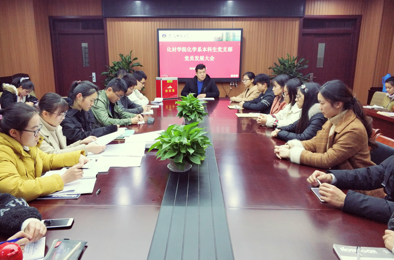化学系本科生支部党员发展大会在礼勤楼702会议室召开。党支部全体党员20人、本次发展对象12人及发展对象入党介绍人魏杰顶老师参加会议。大会由化学系本科生党支部书记蒋建伟老师主持。