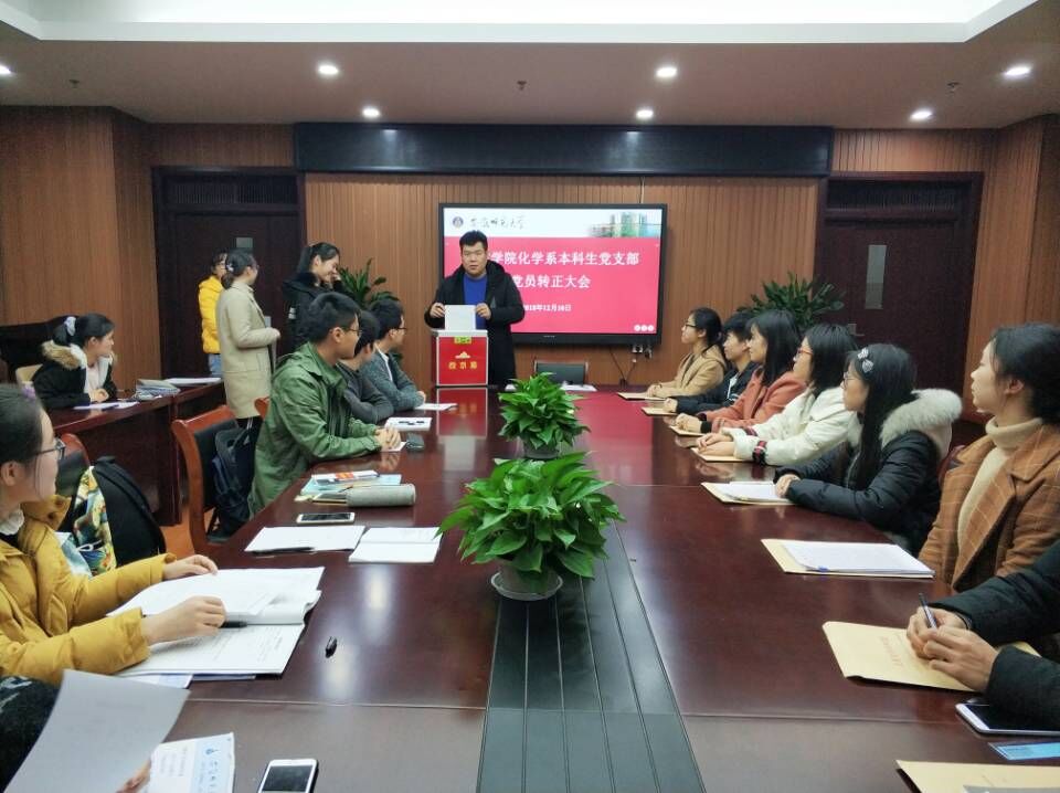 化学系本科生党支部在理科实训大楼702会议室召开预备党员转正大会。支部20名党员(其中正式党员5人)和教育考察联系人参加本次会议。化学系本科生党支部书记蒋建伟老师主持会议。