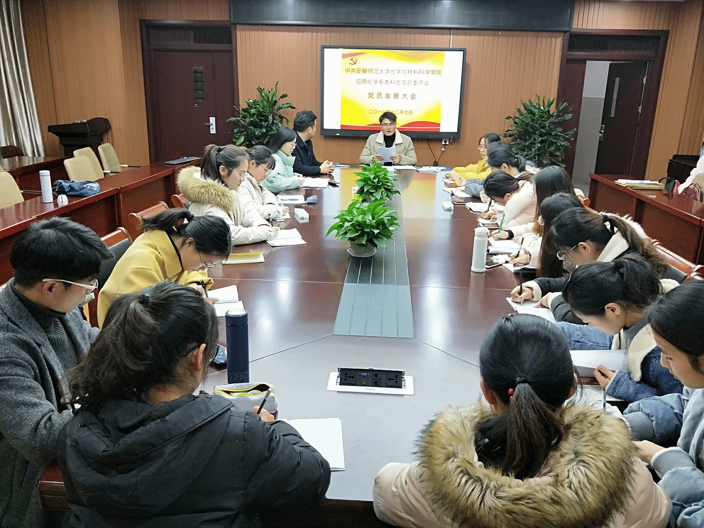 应用化学系本科生党支部于礼勤楼702召开党员发展大会。应化系本科生党支部全体党员,本次发展对象9人及发展对象入党介绍人蒋建伟老师、陈露老师参加会议。大会由应用化学系本科生党支部书记陶勇老师主持。