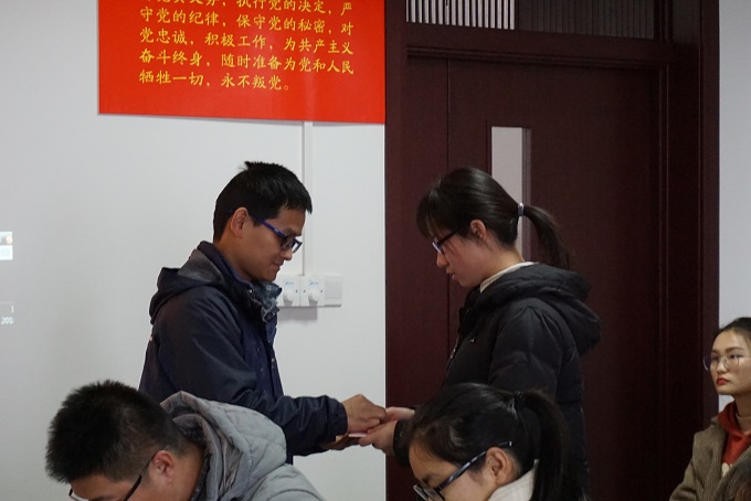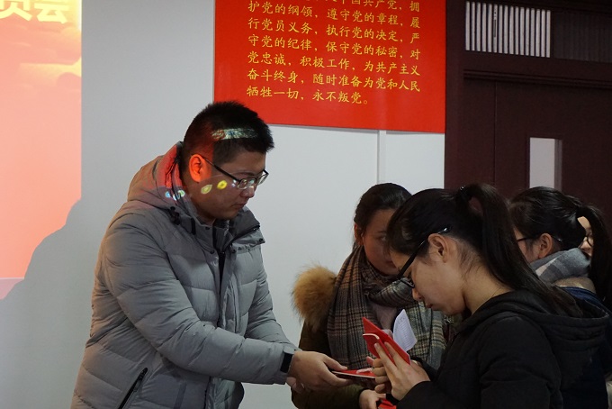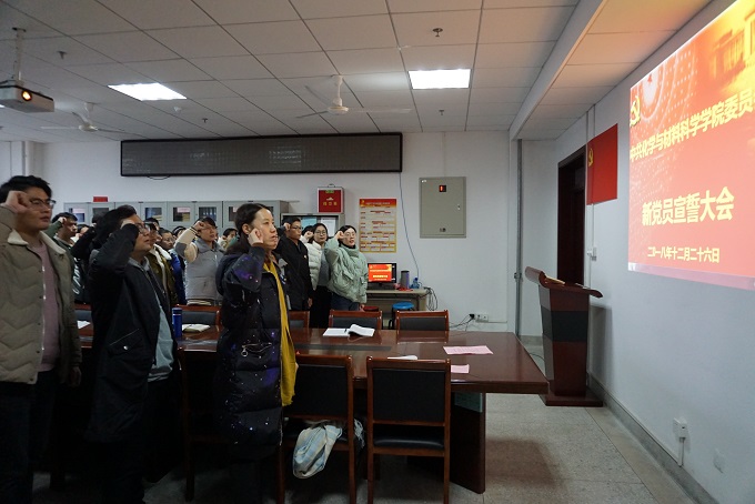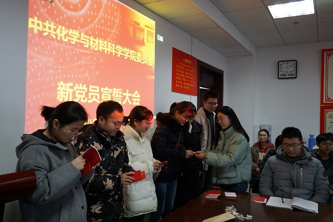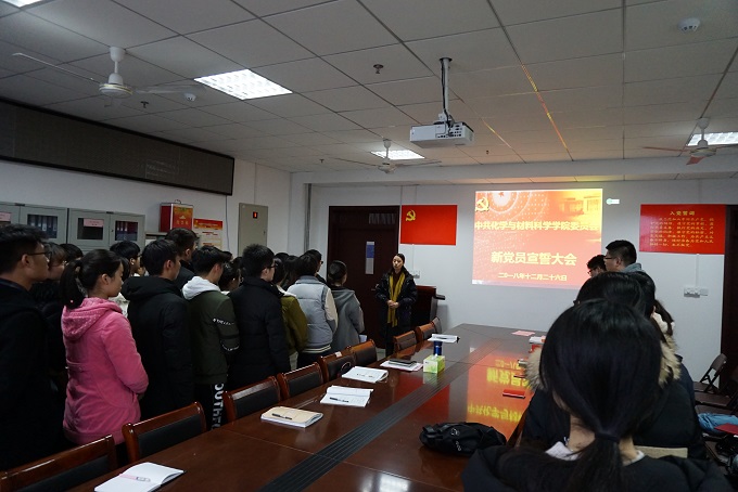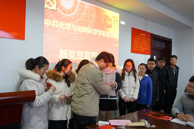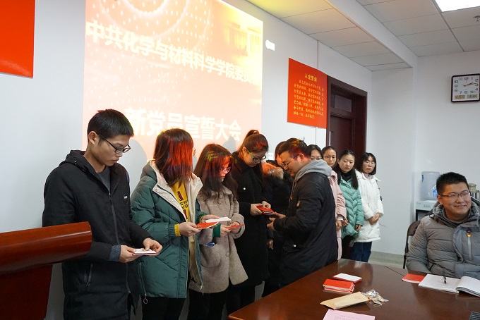 党委宣读了同意47位同志发展为中共预备党员的决定。党支部书记向新党员佩戴党员党徽、发放《中国共产党章程》和《党费证》。新发展党员现场关注了共产党员、安徽先锋网、安徽纪检监察等公众微信号。全体党员在材化系本科生党支部书记陈露老师的带领下进行入党宣誓:“我志愿加入中国共产党,拥护党的纲领,遵守党的章程,履行党员义务,执行党的决定,严守党的纪律,保守党的秘密,对党忠诚,积极工作,为共产主义奋斗终身,随时准备为党和人民牺牲一切,永不叛党。” 宣誓过程庄严凝重,全体党员声声震彻的入党誓词代表了他们对党最忠诚的决心。新党员代表杨帆做了表态发言,决心在今后的工作中将始终牢记自己是一名共产党员,用自己的实际行动和人格力量,践行社会主义核心价值观,做履职尽责的合格党员,为党旗增辉。