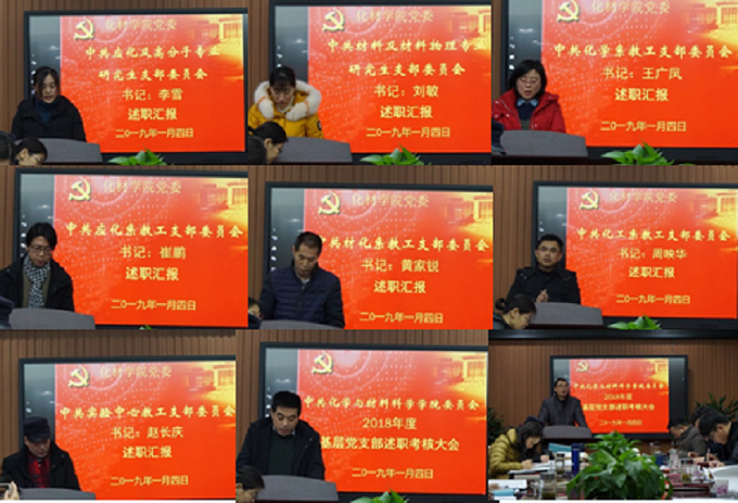 党支部书记抓党建述职评议考核工作的通知》的具体要求,并对述职评议考核大会进行了布置。18位党支部书记在开展总结梳理的基础上,认真撰写述职报告,依次围绕深入学习宣传贯彻党的十九大精神,履行基层党建工作责任,推进基层党组织标准化建设、提升组织能力,强化思想政治工作等方面,结合成绩清单、问题清单、整改清单及支部特色开展述职汇报,并就工作中存在的问题、加强和改进工作的思路措施、2019年党建工作的设想作出了整改承诺。17位党支部书记进行了现场述职,1位党支部书记进行了书面述职。与会人员进行了现场测评。