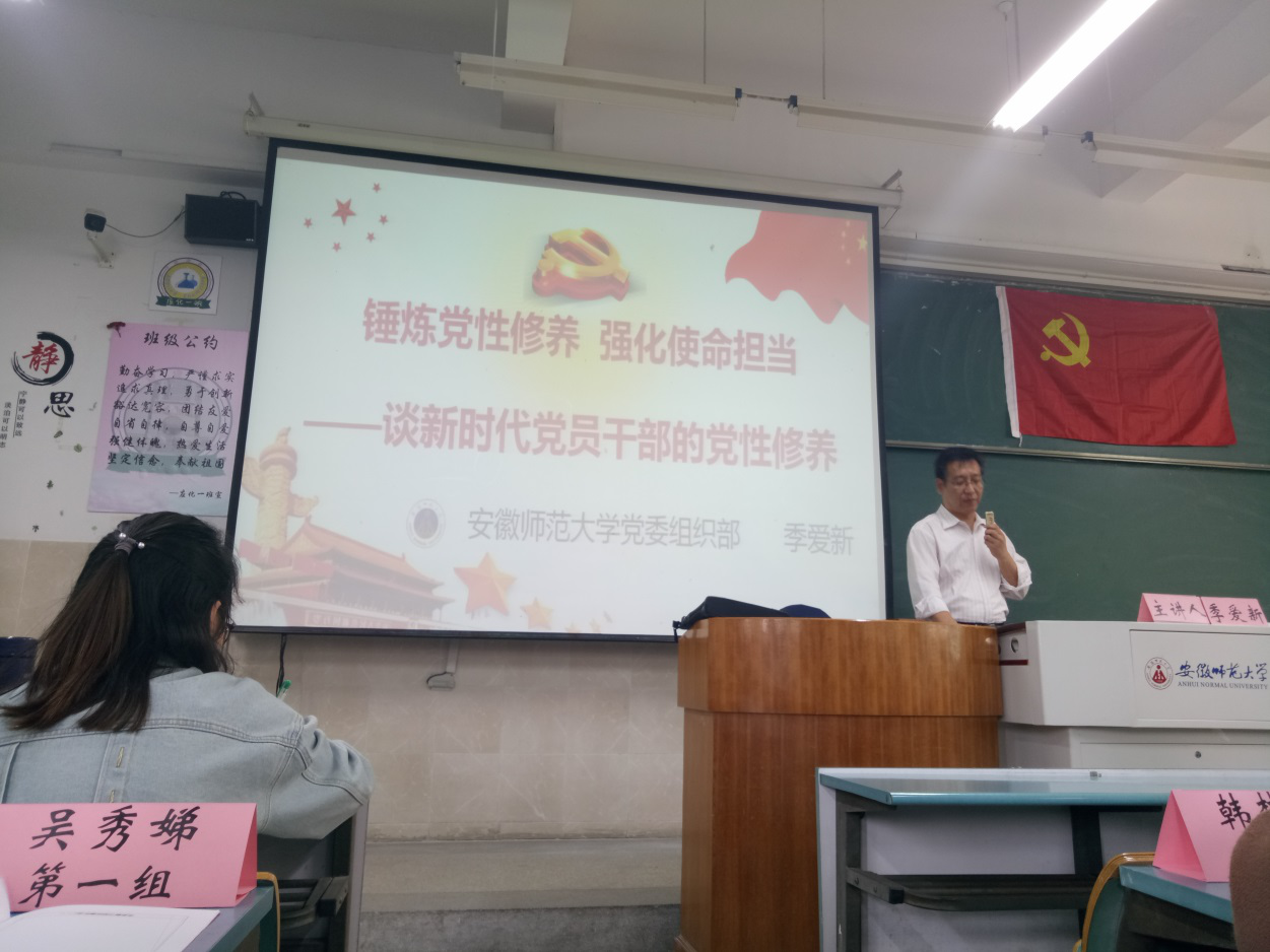 分党校 胡倩倩)为了提高党员培训班学员思想政治觉悟,使全体预备党员深入了解我党,看清我党所面临的各方面挑战,树立正确的人生观,2019年4月13日校党委常委、组织部部长季爱新应邀为全体学员们带来了《锤炼党性修养 强化使命担当》专题学习。党性,是一个政党的基本属性,源于阶梯特性而高于阶级特性,是阶级性最高、最集中的表现。自1938年刘少奇同志发表了《论共产党员的修养》后,我党就一直在强调“党性修养”。在本次授课中,季部长从“为什么要加强党性修养”、“什么是党员的党性修养”、“党性修养的主要内容”以及“如何加强党性修养”这四个维度来阐述新时期背景下的党性修养,为学生党员们开启了一扇认识和提升“党性修养”的明窗。