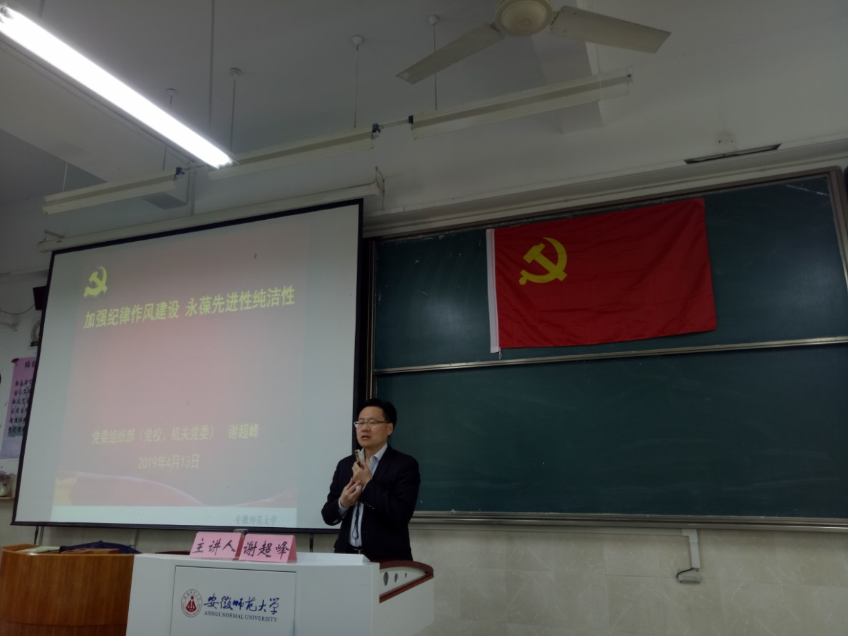 校党委组织部副部长谢超峰应邀为我院第六期党员培训班作题为“加强纪律作风建设 永葆先进性纯洁性”讲座。讲座由本期培训班班主任陶勇老师主持,党员培训班全体学员到场聆听。