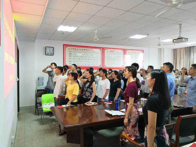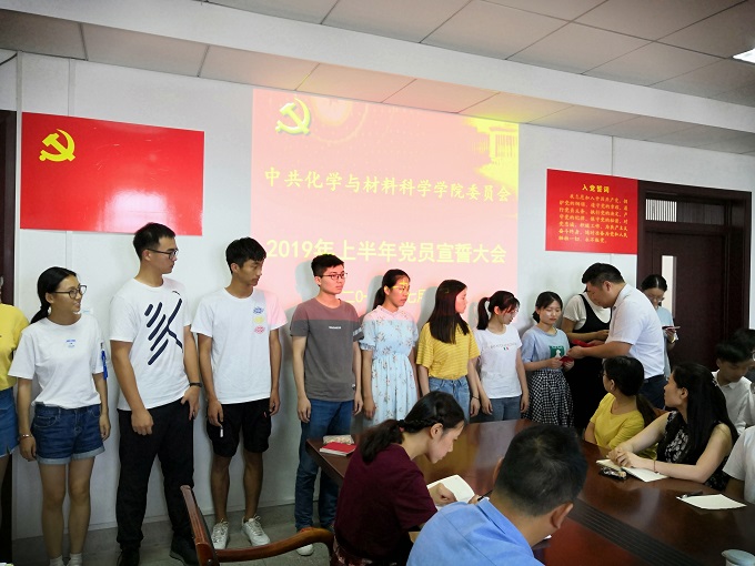 党委委员、支部书记向新党员颁发了《中国共产党章程》,佩戴了党员徽章。全体党员在材化系本科生党支部书记陈露的带领下,在鲜红的党旗面前举起右手庄严宣誓,表达对共产主义事业奋斗终身的决心。余妍霞深情嘱咐新党员:希望他们牢记共产党人的初心和使命,坚定理想信念,增强党性修养,加强学习,成才报国,努力为党旗增辉,为中华民族伟大复兴发挥先锋模范作用。