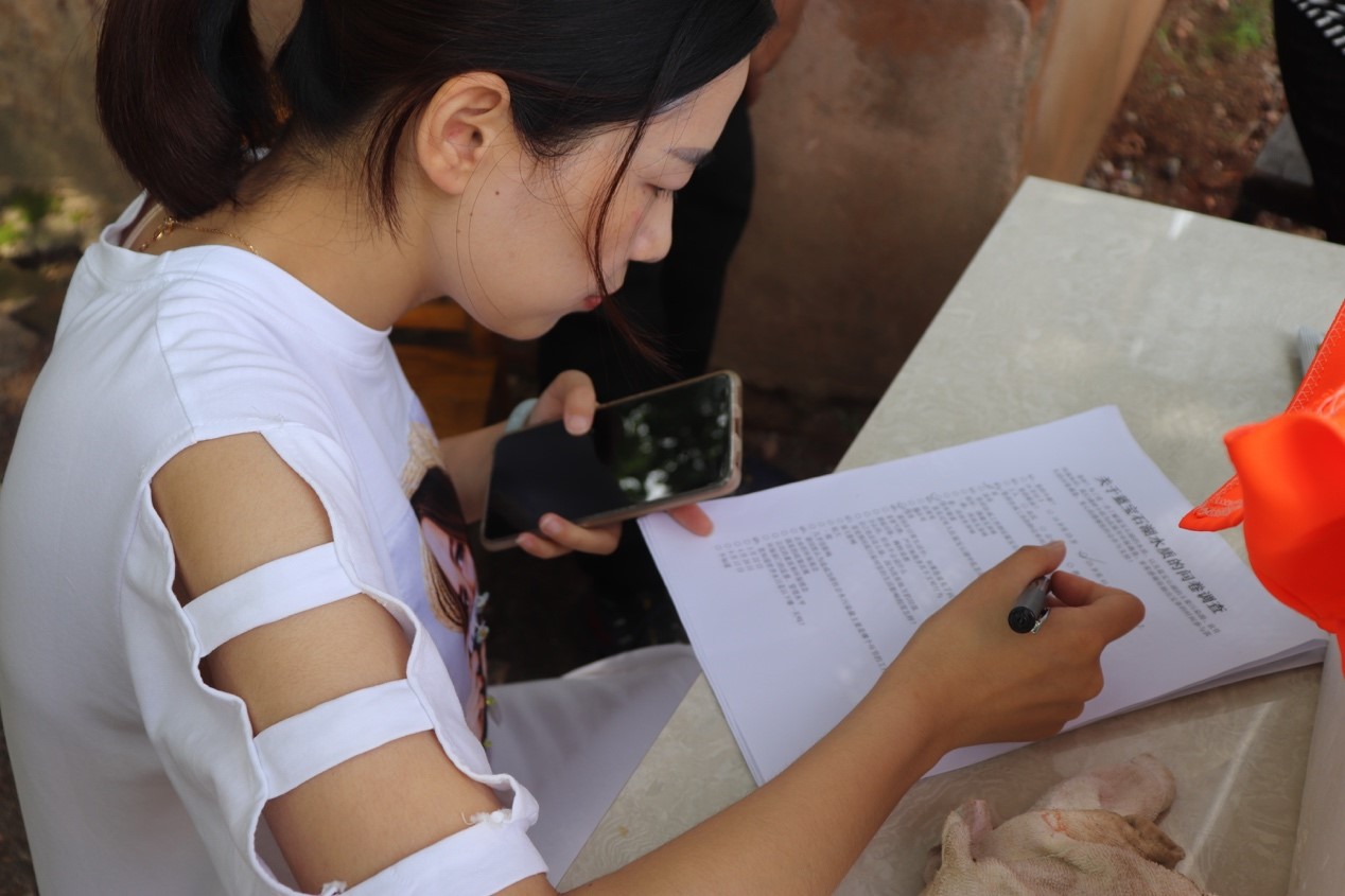 下午,实践成员们在学校内对同学们进行了问卷调查,通过对同学是否了解蓝色湖的成因、是否考虑过蓝色湖治理问题、是否对蓝色湖的建设管理有所建议等等问题,考察同学们对于周边环境的关注程度,激发同学们对于水资源的关注。