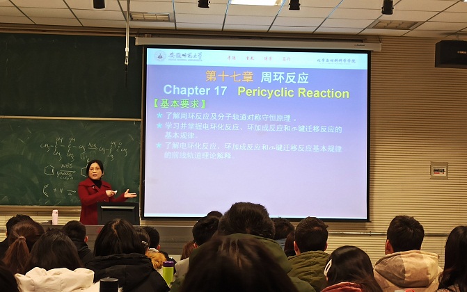 张武老师在行知楼2070501教室给2018级材料化学专业本科生上了一堂有机化学校级示范观摩课。校院两级部分领导老师到场观摩学习。本次公开课主要介绍了周环反应中的电环化反应及相关知识点。