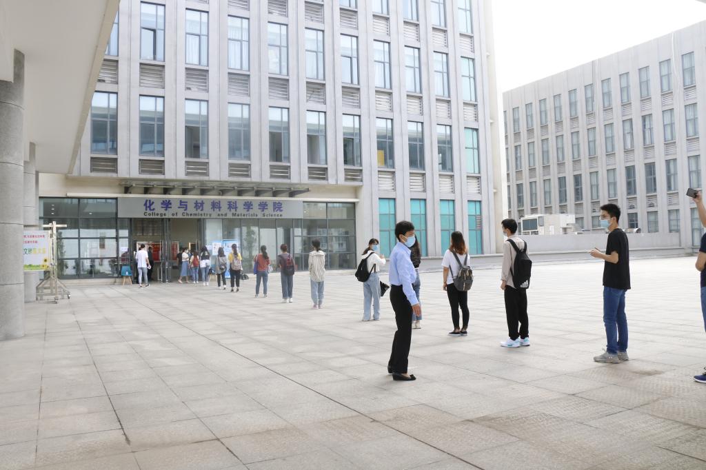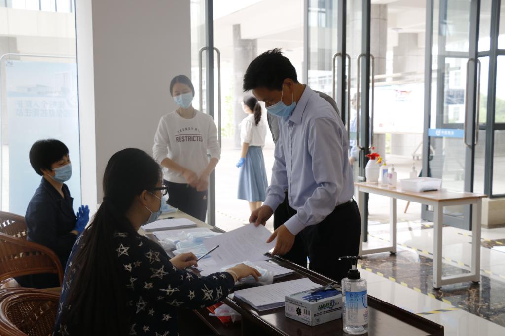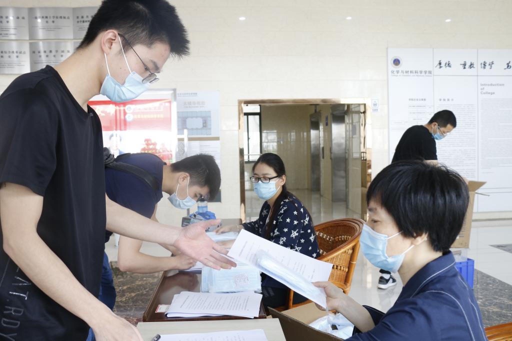 报到处,分年级、分时段安排返校学生进大楼实验室。地面张贴1米间隔线,对报到学生测体温、检查有无戴口罩、签订健康承诺书,给每位同学发放口罩,以实验室为单位发放消毒液。绿帽奴