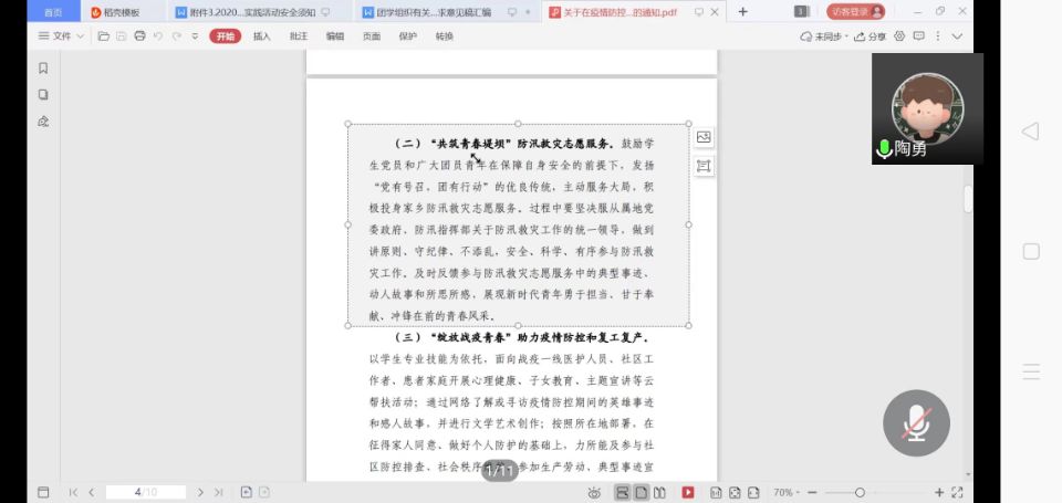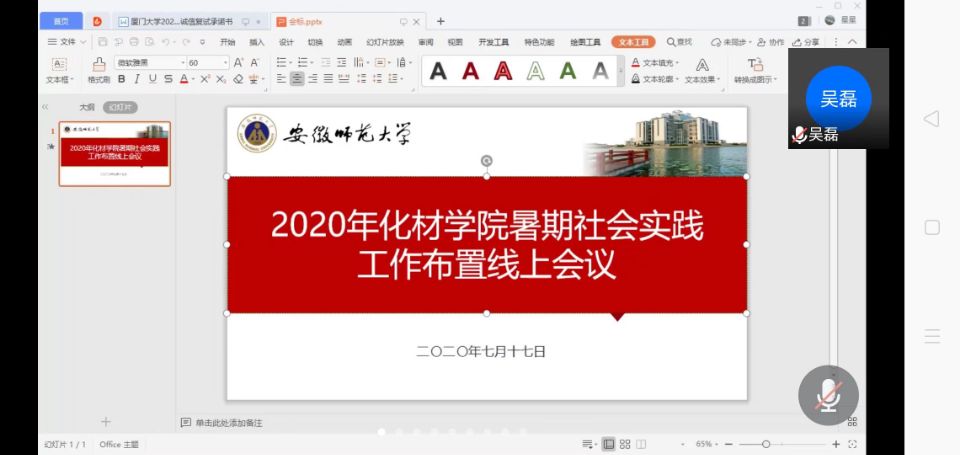 持续推进分类指导,全面开展线上答辩。动员会结束之后,各团队结合自身实际情况,确定实践方向和具体实践内容。7月25日晚,所有线上团队分为爱心支教团、战疫青春团、脱贫助力团和青春筑堤团四大类依次进行团队立项答辩,院党委副书记余妍霞、团委书记陶勇及各年级辅导员参与指导,各实践团队围绕团队概况、实践方案、活动准备和预期成果等方面进行线上答辩,并根据团队指导老师的意见进一步完善方案。
