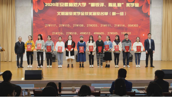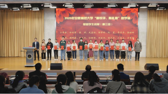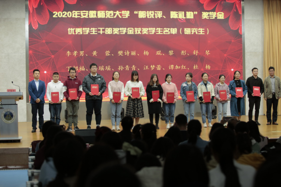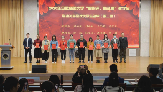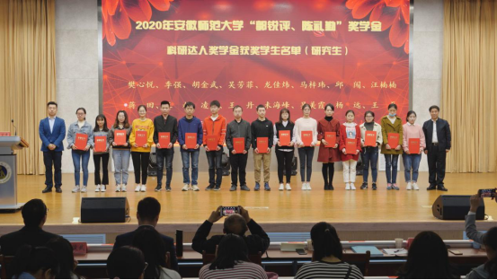 2020年“郭锐评、陈礼勤”奖助学金颁发决定。随后,芮彬云先生、张池先生和现场嘉宾分五个批次向获奖受助学生颁发奖助学金。2017级化学师范专业王磊同学和2017级材料化学专业陈柔同学分别代表获奖、受助同学发言,两位同学对郭锐评女士、陈礼勤博士的无私资助表达了诚挚的感激,并向学校、绿帽奴