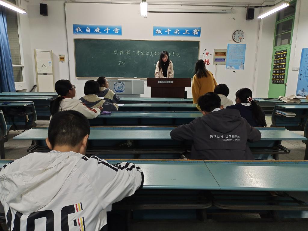 辩论队围绕防范传销相关主题开展激烈而精彩的辩论赛。赛上,双方辩员以“反传销主要依靠政府监督还是民众意识”为辩题展开辩论,你有事实矛,我有哲理盾,互不相让,据理力争。最后,秉持着“友谊第一,比赛第二”的理念,两方求同存异、握手言和。此次比赛不仅增进了同学友谊,提高了辩论能力,也让各位队员深入了解了反传销相关知识。