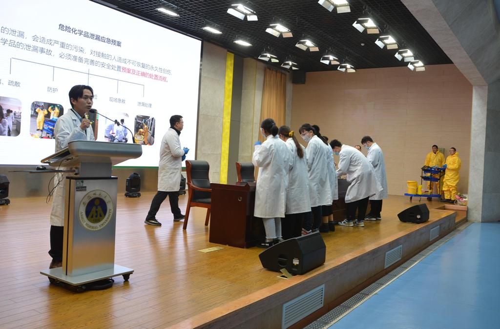 老师和同学的配合下进行现场实操演练,对实验室事故发生的原因、进展的过程、处置的结果等进行了情景再现,并由翟老师一一讲解每一环节的注意事项和正确处理方式。