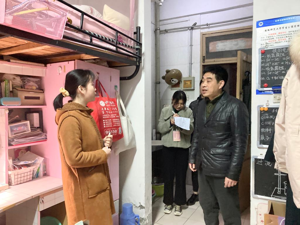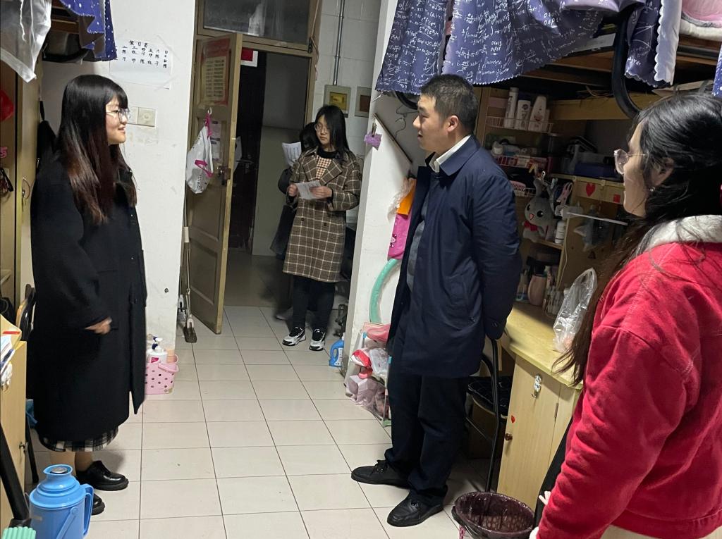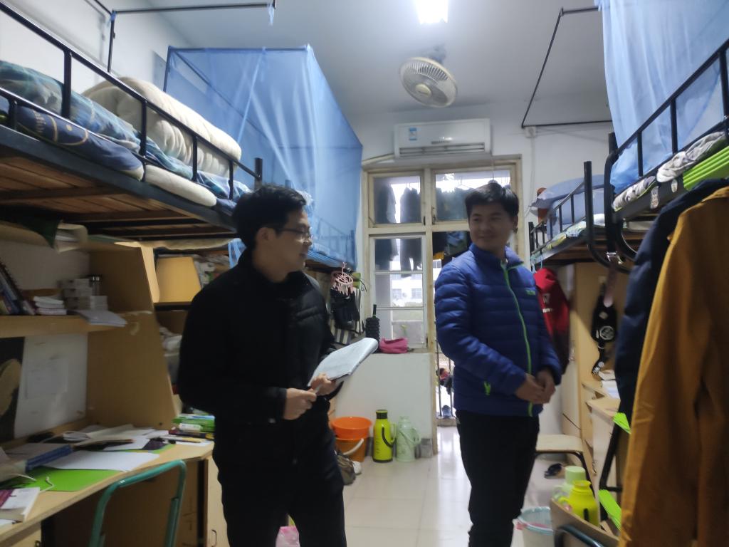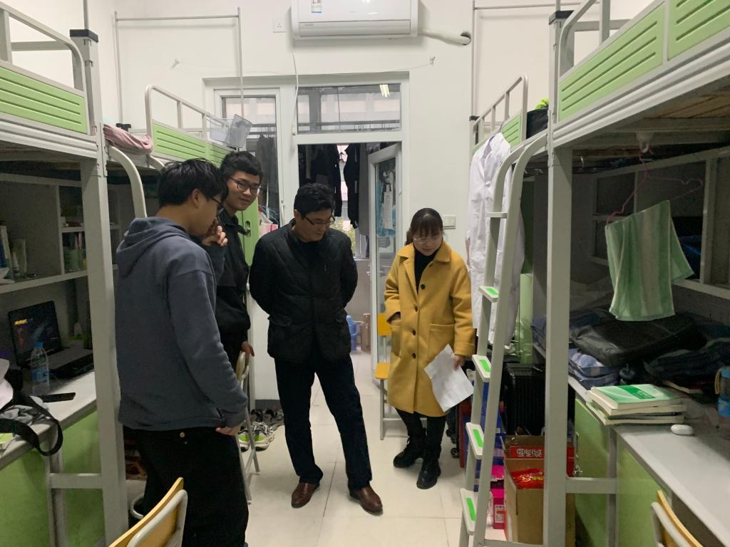 领导班子带领全体专兼职辅导员分组走进学生宿舍,通过宿舍走访、安全卫生检查等方式,进一步了解新学期学生思想动态和学生在宿舍学习、生活情况。