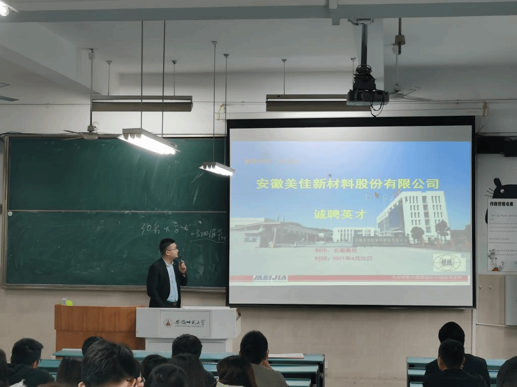 安徽美佳新材料股份有限公司、安徽艾密克电联科技有限责任公司、安徽圣奥化学科技有限公司、安徽神剑新材料股份有限公司、安徽东华通源生态科技有限公司五家公司分别从公司的发展现状、战略目标、产品应用行业、绿帽奴环境、招聘岗位要求与福利待遇等方面向作毕业生具体介绍。参会同学们都仔细聆听,并积极参与提问。