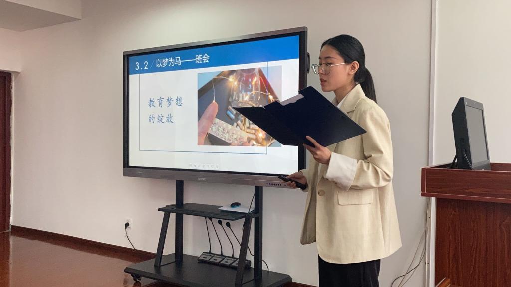 活动第二部分是由赵海怡和张瑶佳同学分别进行中期实习班主任工作成果汇报和教育教学实习成果展示。班主任工作是依据德、智、体、美、劳五个方面,开展班级工作,全面教育,管理指导学生,树立良好的学习习惯和培养良好的道德品德。汇报从学校早读管理、早操管理、午间静校值班、主题班会的观摩和开展以及对校园、班级文化活动的组织参与五个方面汇报实习生参与学校管理和班主任工作的方方面面。只言片语道不尽这6周来班主任工作的丰富多彩,相信参与班主任工作一定会在实习生的人生画卷上添上浓墨重彩的一笔,对以后的人生规划大有裨益。纸上得来终觉浅,绝知此事要躬行。课堂教学则是实习最重要的环节,只有根植于课堂教学,才可以对课程教学有着更好的把握,同时也对教材有更深入的了解,实习生参与课堂教学在实习过程中意义重大。教育教学实习成果展示从“破晓而生,踏浪而行”、“教学相长,渐入佳境”、“笃学勤思,学无止境”、“全力以赴,心有所期”四个方面展示了实习的教育教学成果,真情流露。尽管在许多方面依旧有不足,路漫修远,上下求索,是对教育教学工作最真实的写照。