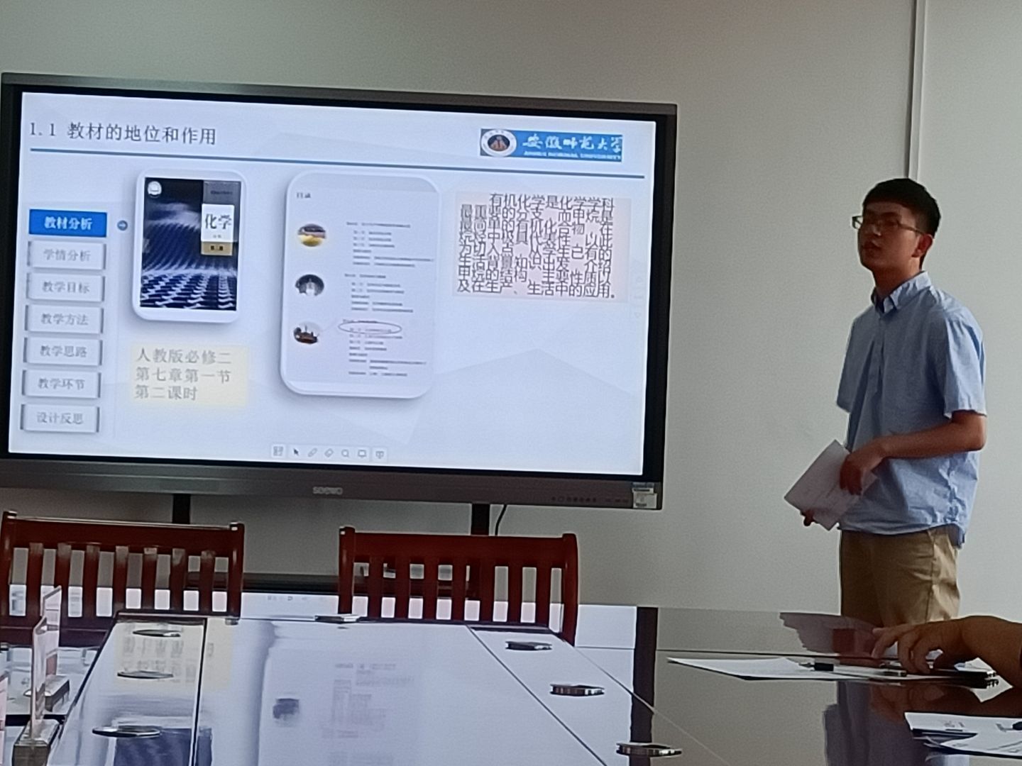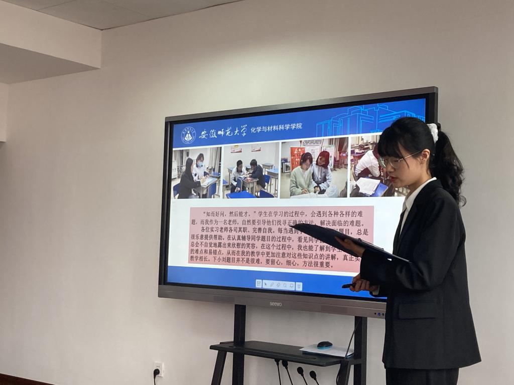 活动展示的第一部分是实习生的说课比赛。各实习生经过一周时间的反复打磨,并在指导老师给出的意见基础上进行认真修改。每一位实习生都展示了自己对课程课时教学的设计理念,并融入了数字化实验教学,将化学核心素养融入了教学过程中,当然也有许多的不足,老师在活动结束后都有一一指正。这次说课展示了实习生在实习学校实习的成果,不同于在大学单纯理论性的讨论课时设计,各位实习生更能够结合实际教学的可操作性,进步明显。