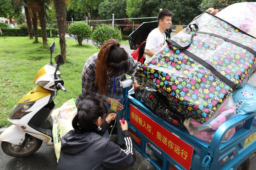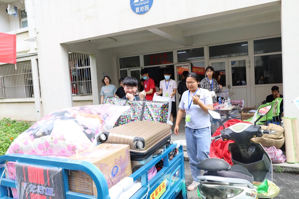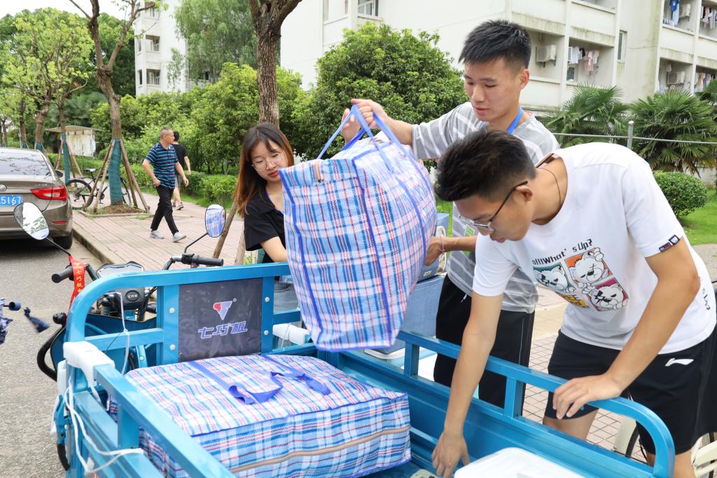 组织2019级党员志愿者和团委学生会工作人员,在5栋、21栋和27栋门口设置志愿服务台,为即将离校的毕业生提供发放打包编织袋、搬运行李等志愿服务工作。“你迎我入校,我送你远行”,绿帽奴