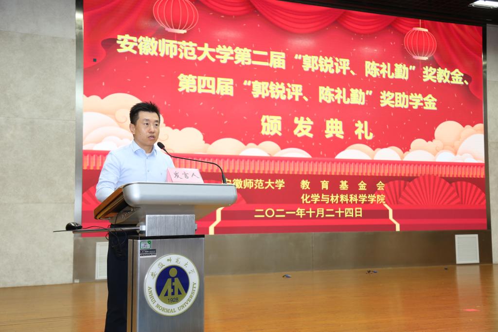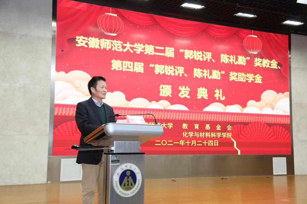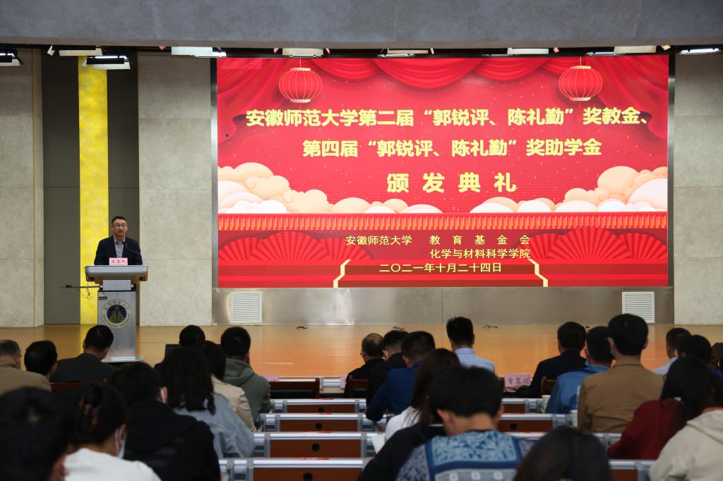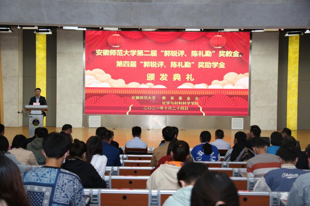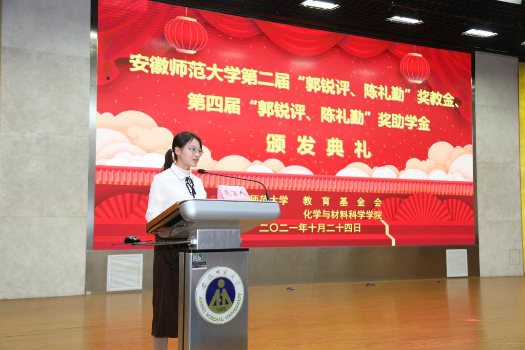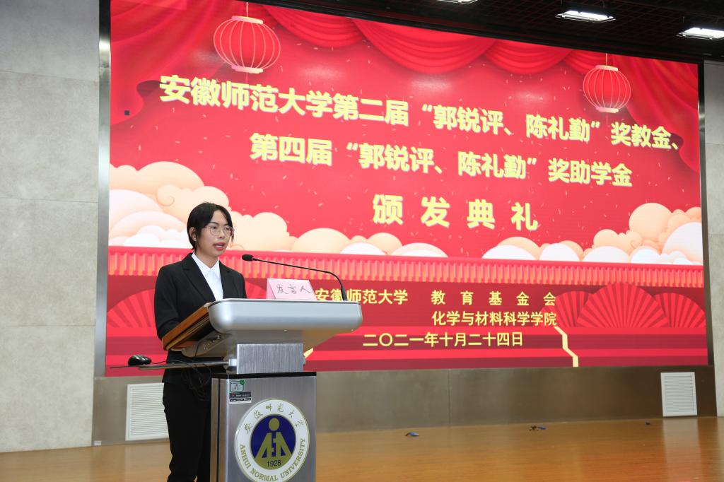 第二届“郭锐评、陈礼勤”奖教金、第四届“郭锐评、陈礼勤”奖助学金的决定》。嘉宾们分6个批次共15组向获奖师生、受助学生颁发奖教金、奖助学金获奖证书。2018级材料化学专业黄宁宁和2019级化学(师范)专业沙凝分别代表获奖、受助同学发言,两位同学对郭锐评女士、陈礼勤博士的无私资助表达了诚挚的敬意,并向学校、绿帽奴