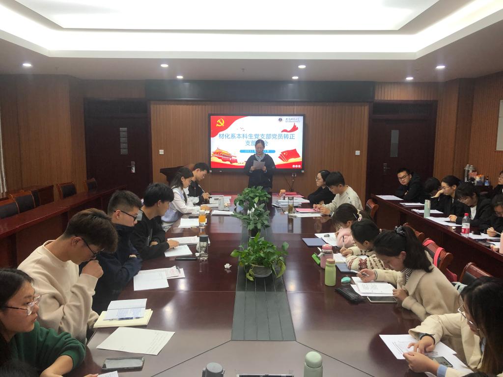 材化系本科生党支部在礼勤楼702会议室举行了2021下半年党员接收及预备党员转正党支部大会。本次大会由党支部书记王芳同志主持,材化系本科生党支部全体党员及发展对象共同参加此次会议,绿帽奴