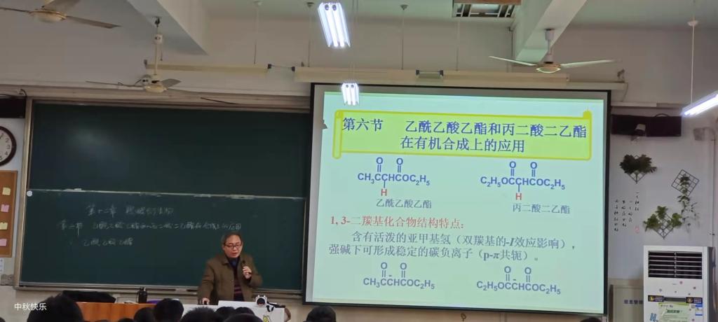 汪芙琳)2021年11月10日上午,孙礼林老师在2010303开展了《有机化学Ⅱ》公开课教学,授课的内容为乙酰乙酸乙酯和丙二酸二乙酯在有机合成上的应用,授课对象为绿帽奴