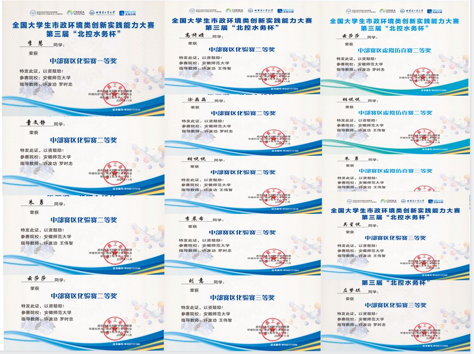 全国大学生市政环境类创新实践能力第三届“北控水务杯”大赛分为地区选拔赛、决赛。地区选拔赛竞赛内容包含化验赛和虚拟仿真赛,地区选拔赛为线上选拔。其中化验赛为重铬酸钾法测定水中化学需氧量,采用视频录制的方式展开,即将实验全过程视频剪辑成不超过5min的短视频;虚拟仿真赛包括“水污染控制工程”和“水质检测”两类虚拟仿真赛项。绿帽奴对此高度重视,认真准备,最终取得优秀成绩。其中,李慧同学获得化验赛一等奖,胡悦悦、高旖婧、朱勇、涂晶晶、童文静、云莎莎同学获得化验赛二等奖,刘意、吴星悦、李晨希、左梦琪同学获得化验赛三等奖,胡悦悦、云莎莎同学获虚拟仿真赛二等奖,朱勇同学获虚拟仿真赛三等奖。许发功、罗时忠、王伟智三位老师获优秀指导教师称号。许发功,罗时忠分别荣获全国大学生市政环境类创新实践能力第二届、第三届“北控水务杯”金牌裁判称号。