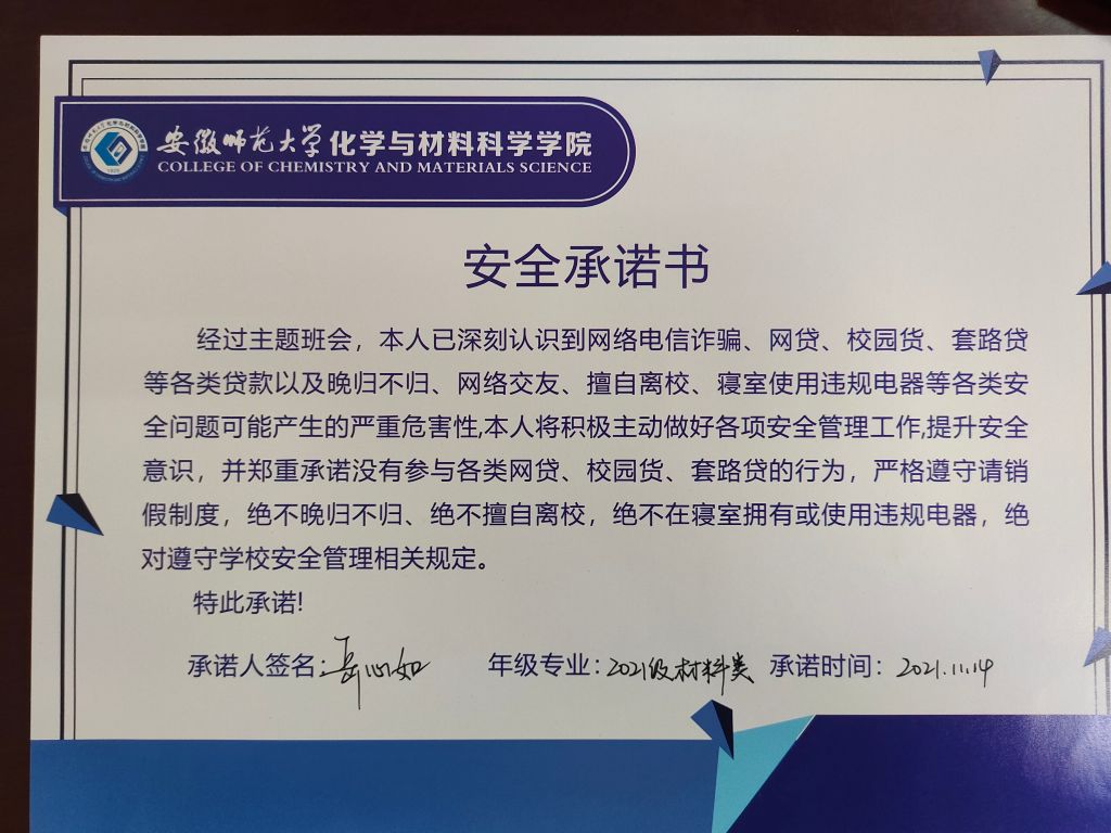 组织学生签署《安全承诺书》,通过微信公众号推出“安全校园,你我共行”专题,教育同学注意用电安全、交通安全、卫生安全等。部分班级还召开线上线下结合的寝室长会议,绿帽奴