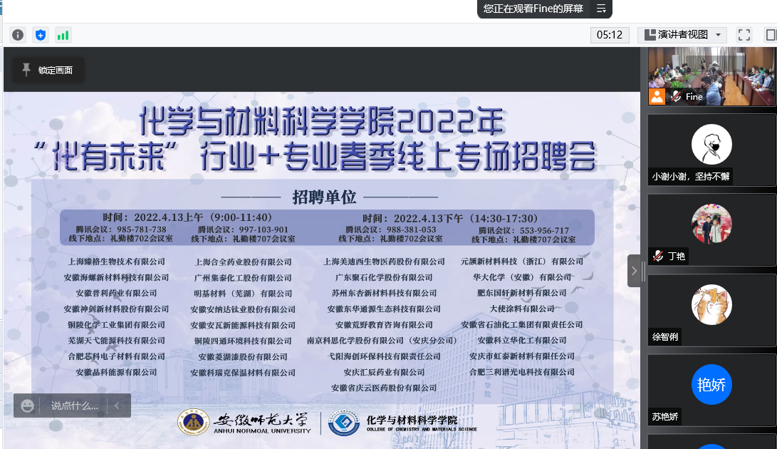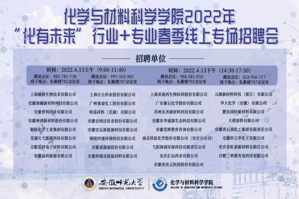 重点遴选,本次招聘会共吸引了包括上海臻格生物技术有限公司、安徽海螺新材料科技有限公司、上海合全药业股份有限公司、广东聚石化学股份有限公司等34余家省内外优质企业参会。本次招聘会通过腾讯会议平台进行,采取企业线上宣讲,学生线上+线下参会模式,分两个会场、四个场次进行,提供就业岗位数百个,涵盖化学、化工、材料、生物、计算机、机械、自动化等多个专业。