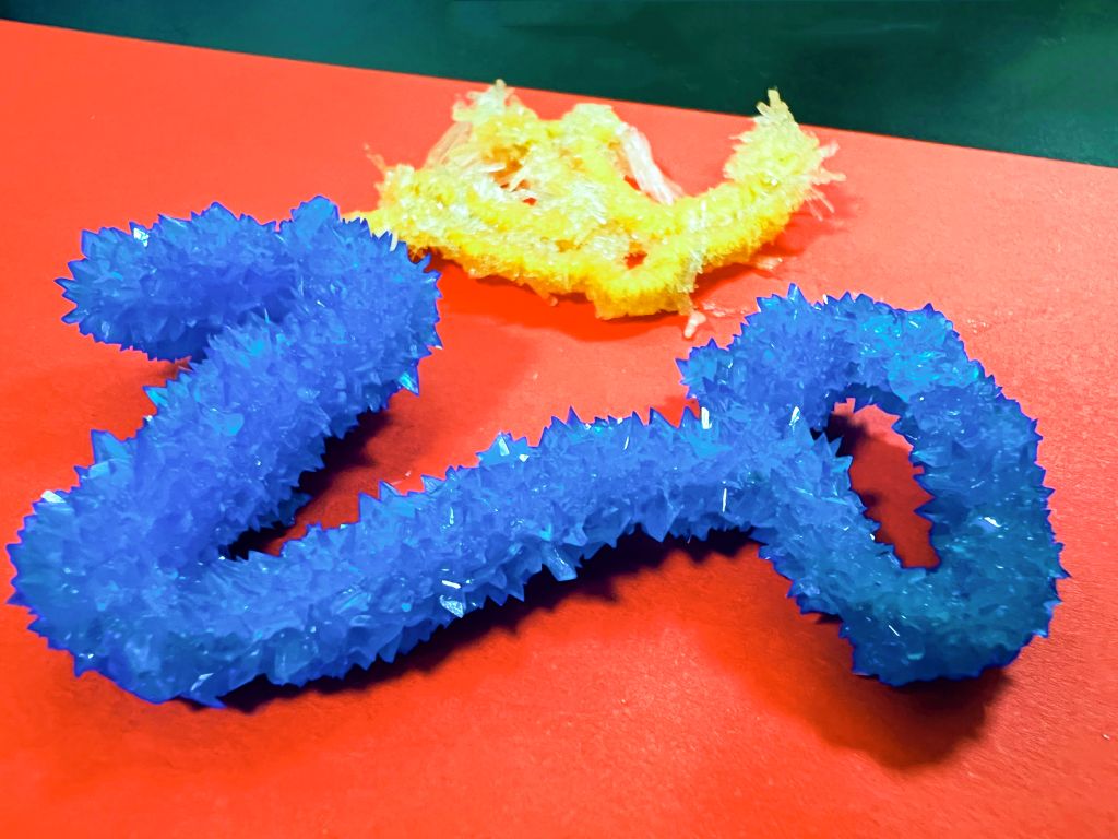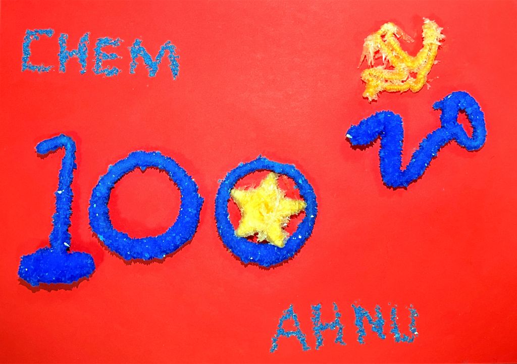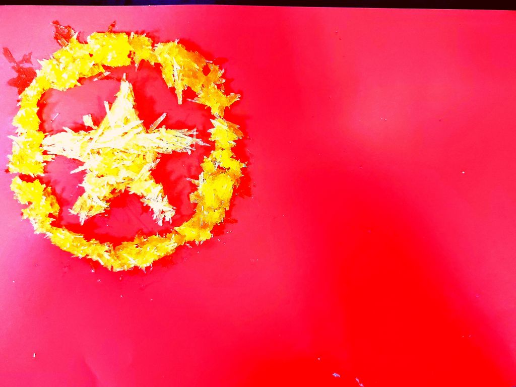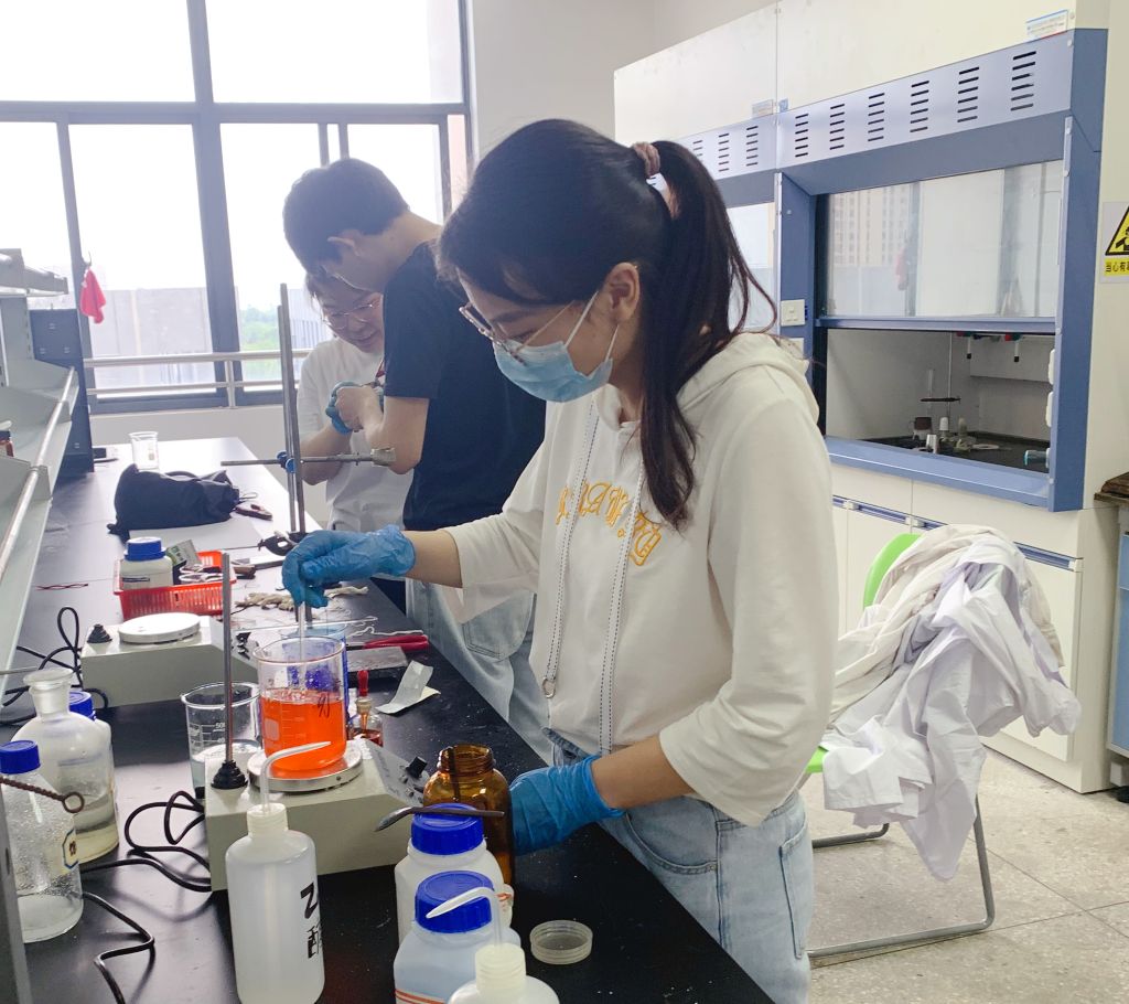 化材学子们发挥主动创造性,以红色文化标识等为主要内容,设计出创意图案,并在老师的指导下走进实验室,利用化学科学专业知识与技能,通过溶液、熔融、化学气相沉积等方法制作与主题相关的创意晶体。在制作晶体过程中,每个团队的同学齐心合作,秉承着认真细致的科研精神,自行设计化学实验并制作出了具有红色寓意的晶体。同时,同学们通过自主设计性实验提升了自己的实验操作能力和创新能力,有的团队利用硝酸和氢氧化钴的反应,利用超声和重结晶,得到红色晶体后将其拼凑成“100”的图案,为党的百年诞辰送上真挚的祝福;有的团队则利用橙红色的重铬酸钾晶体等加工绘制成图案,致敬党的百年华诞;有的团队用搭建好的框架自然结晶沉淀出相应的“100、五角星、党徽等图案,庆祝中国共青团建团100周年;有的则充分发挥自身想象力,利用碘化铅等试剂设计出“百年‘晶’‘碘’,传承‘铅’载”的晶体作品。