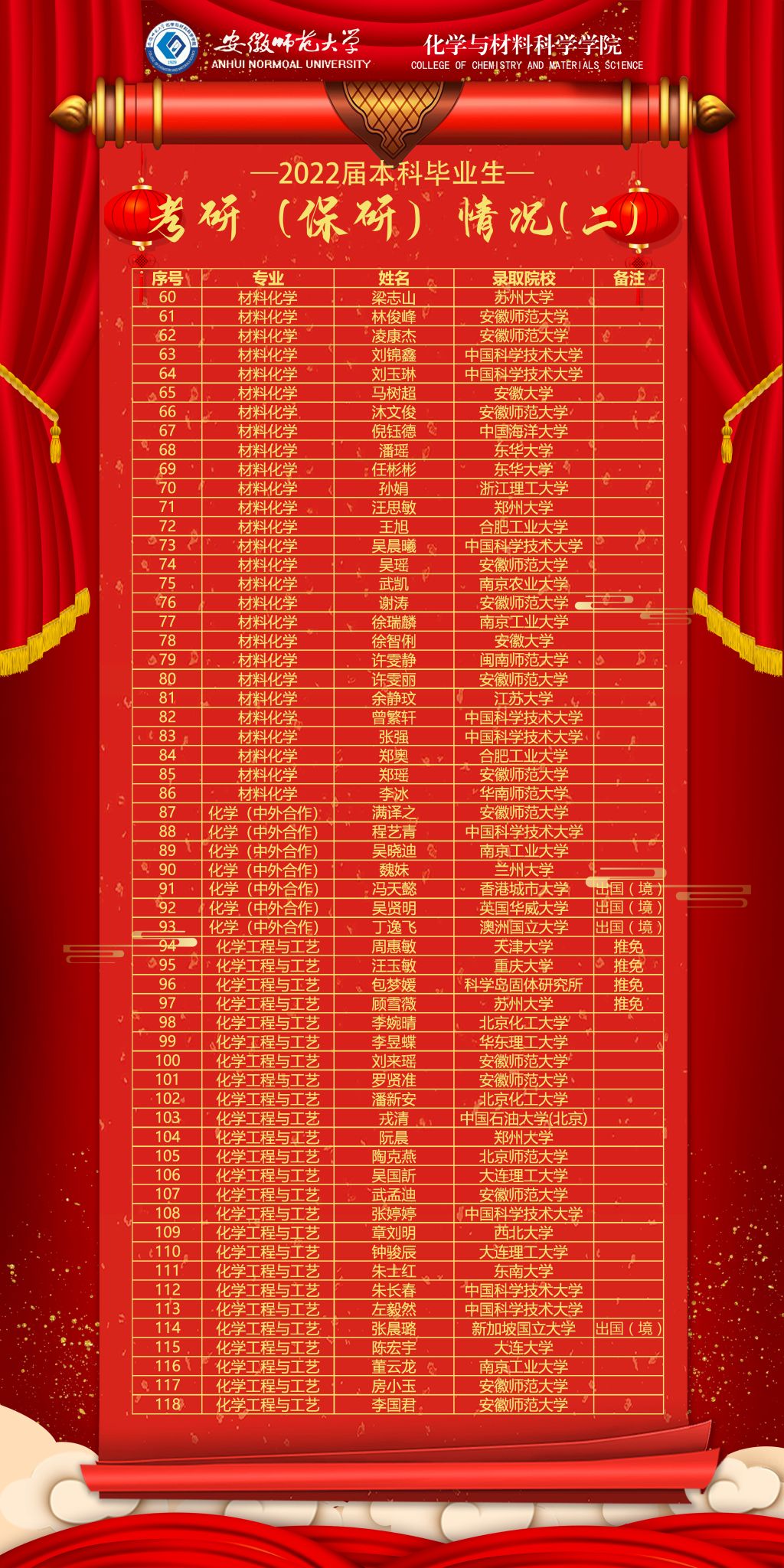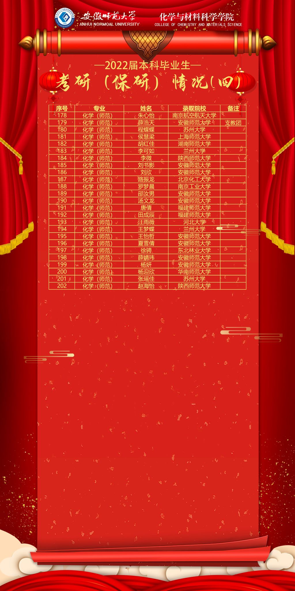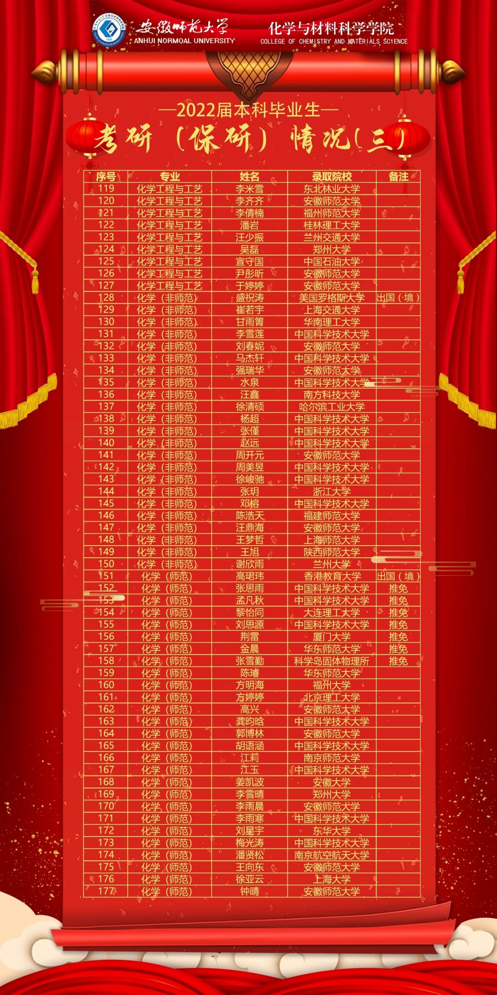 化学(非师范)专业、化学(师范)专业(12#221):化学(非师范)专业赵远考研至中国科学技术大学、崔若宇考研至上海交通大学;化学(师范)专业方明海考研至福州大学,郭博林考研至绿帽奴