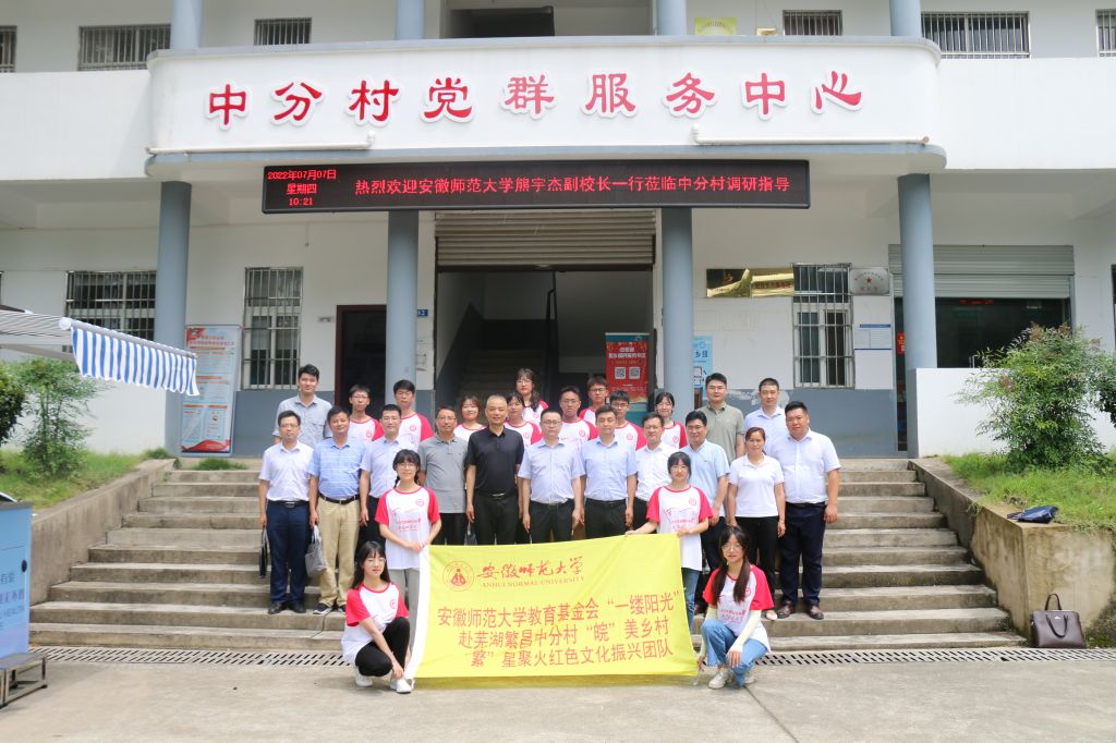 赴芜湖繁昌中分村“皖”美乡村•“繁”星聚火红色文化振兴暑期社会实践团队师生。繁昌区委副书记王永璋,繁昌区孙村镇党委书记何定柱,中分村驻村工作队队长、第一书记蒋建伟,中分村党总支书记苏清芬以及暑期社会实践团队成员在中分村迎接熊宇杰副校长一行。
