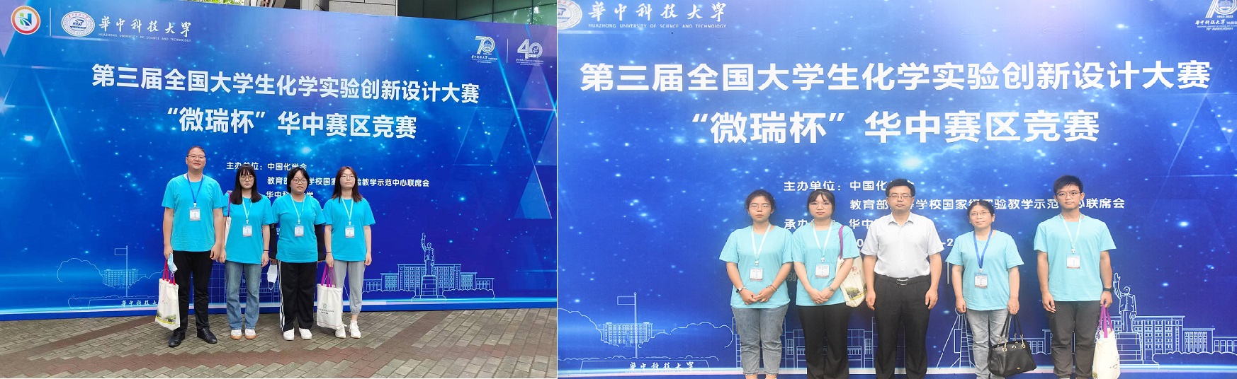 预赛和最终的决赛,遴选出三个项目参赛。最终两支队伍代表绿帽奴前往武汉参加华中赛区复赛。赛前,团队指导老师和学生进行了充分的准备,不断打磨作品,注重细节,精益求精,反复排练。在复赛中,同学们敢打敢拼,经过PPT汇报演示和现场答辩等激烈角逐,最终张武老师指导的冯登霖、金利珍、孙启可同学“碘基成环”团队作品《电化学氧化合成磺内酰胺》在新创实验赛道获得一等奖;刘金云、韩阗俐老师指导的杨珊珊、孟依静、王林琳同学“多彩珍珠”团队作品《美丽的络合反应——神奇的变色珍珠》在科普实验赛道获得二等奖。