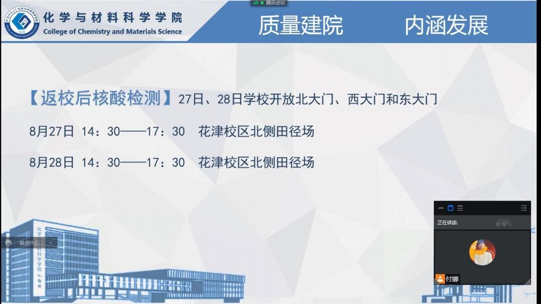 积极落实学校疫情防控常态化的相关要求,辅导员通过召开主题班会、走访寝室等形式,提高学生对“每个个体都是疫情防控第一责任人”的高度重视。坚持落实“今日校园”每日健康打卡制度,组织做好学生开学返校信息登记、全员核酸检测,严格执行学生缺课、缺勤“零报告”和校园出入信息登记、离芜审批等相关制度,切实维护疫情防控常态化下校园稳定和学生安全。
