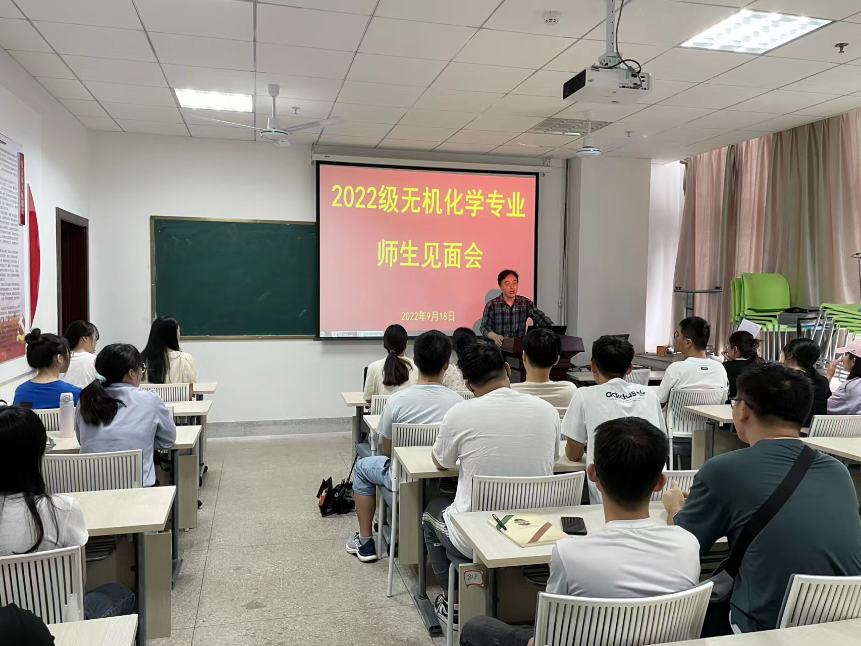 层面进行专题教育之前,各学位点负责人、新生辅导员还通过点内师生见面会、开学第一课等方式开展新生入学教育,积极引导新生扣好“人生第一粒扣子”,帮助他们迈好大学的第一步。学位点师生见面会环节,各学位点的负责人对学位点内的导师以及他们具体的研究方向进行了介绍,从明确目标、有效沟通、积极心态、大量的时间投入四个方面勉励同学们加强学习,努力钻研,早日成为综合素质高、独立工作能力强、能承担国家重任的栋梁之才。各位新生也在了解了各位导师的研究方向后,根据自己的兴趣选取了相对应的导师,明确了今后研究的目标与方向。辅导员新生入学第一课环节,辅导员张薇细致讲解了研究生思想政治教育工作、班风学风培养、研究生日常管理、奖助贷、校园文化活动相关与研究生学习生活息息相关的事务,并且勉励各位新生学会独立思考,争取在科研和课外活动方面书写出崇实求新的精彩华章。