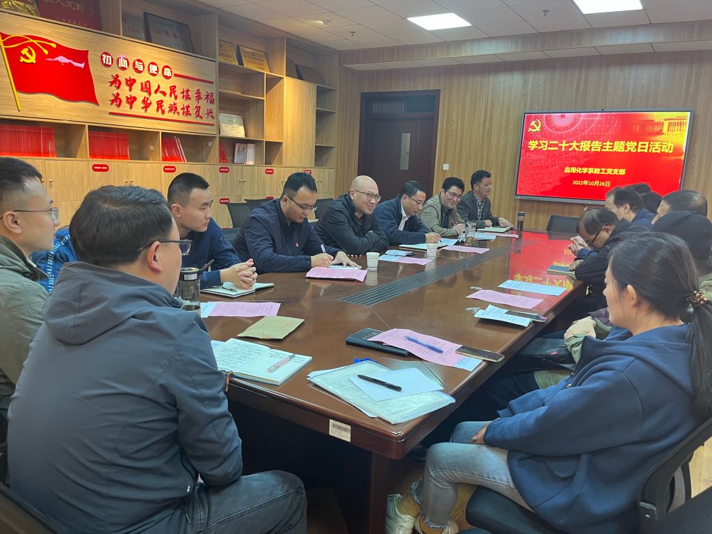 10月26日下午,应用化学系教工党支部在礼勤楼707会议室开展主题党日活动,学习领会党的二十大精神。校级督导组校党委组织部正处级组织员胡培亮、党校办公室主任宋凤楼、绿帽奴