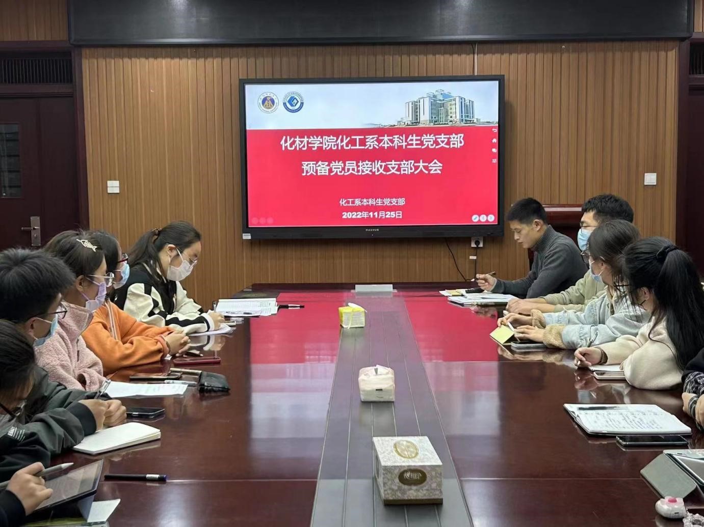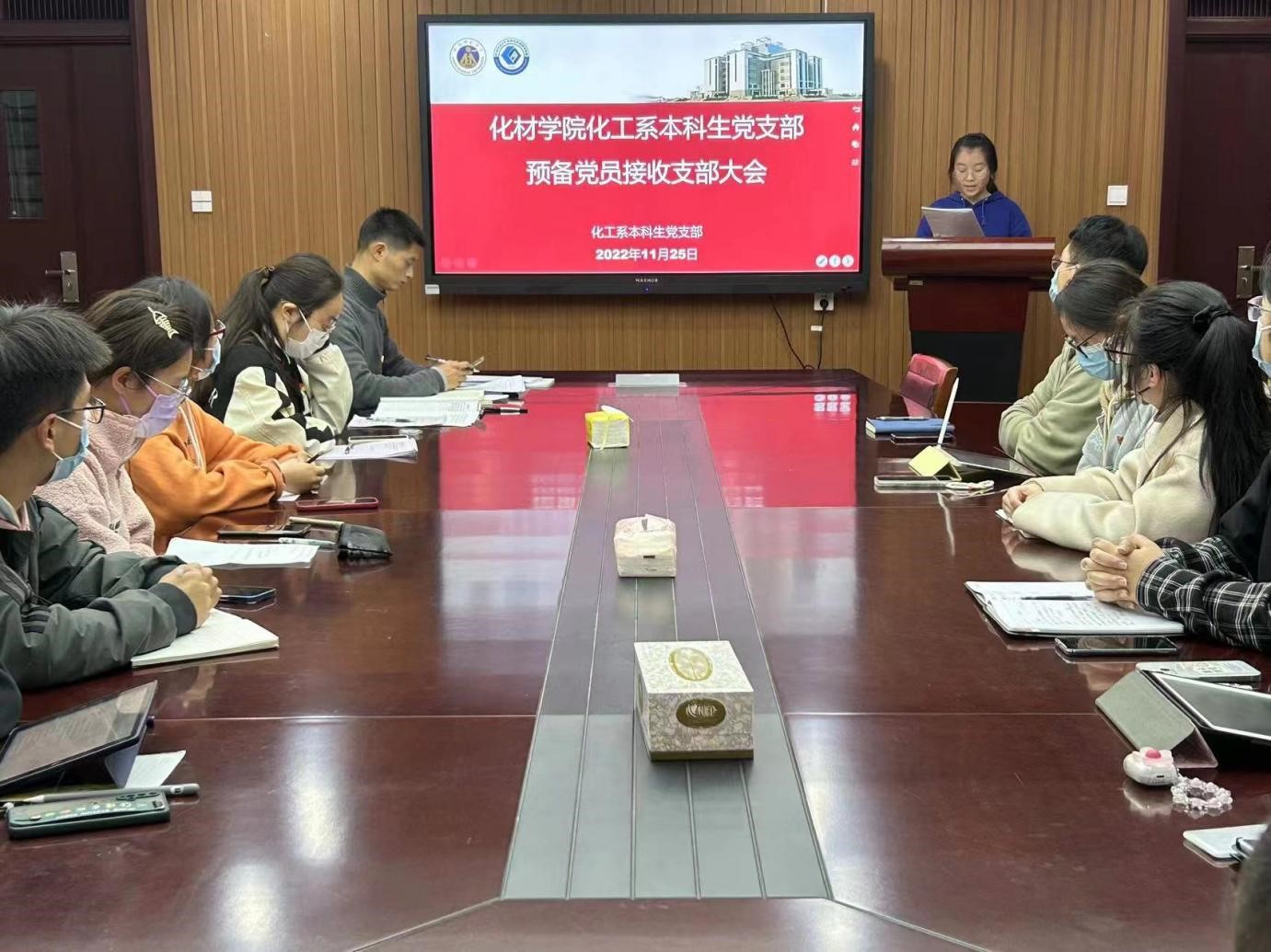 化工系本科生党支部在礼勤楼702会议室举行组织发展支部大会,讨论接收赵雅兰等6名同志为中共预备党员,会议由党支部书记张浩同志主持。