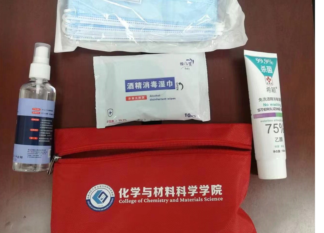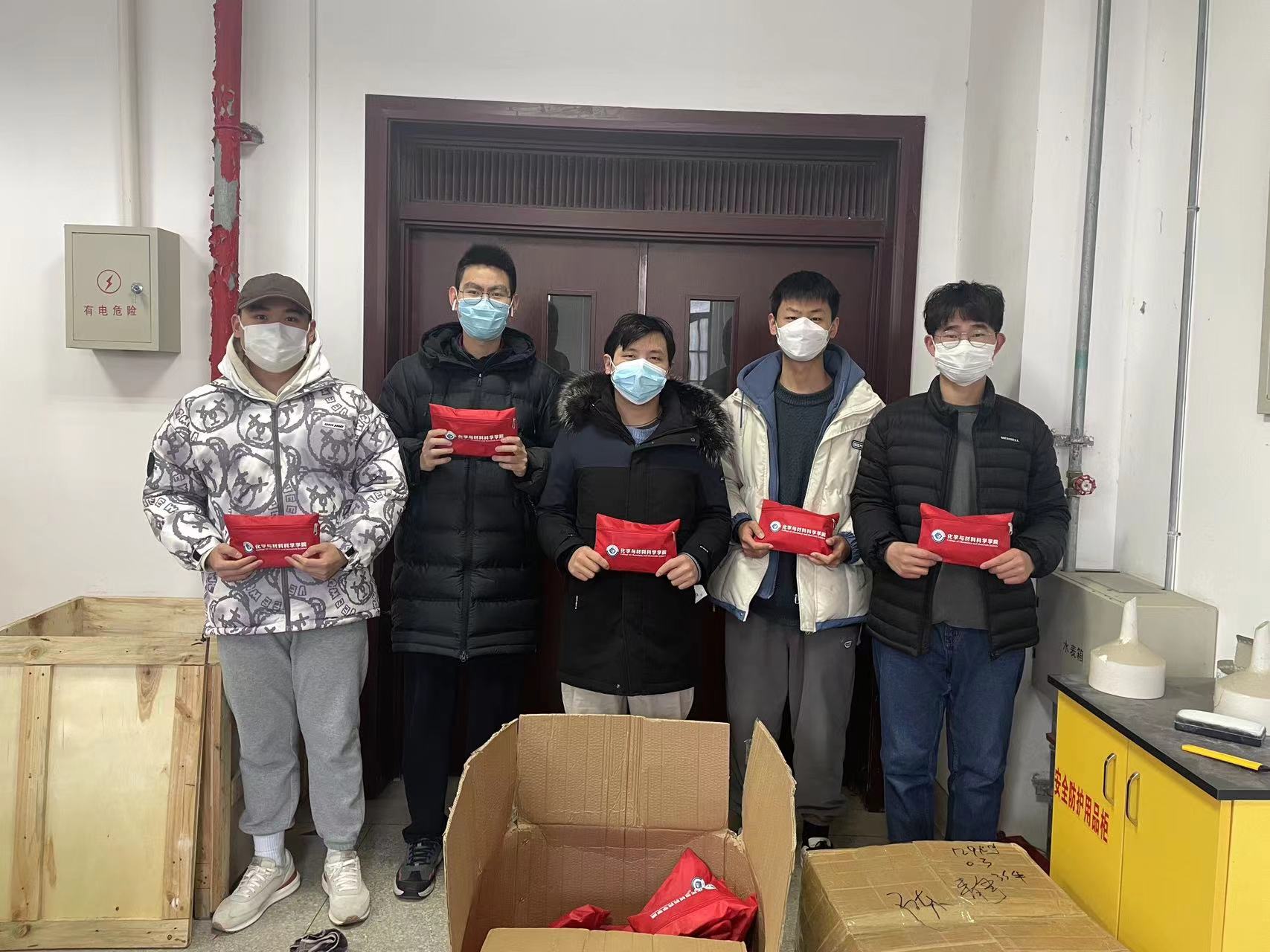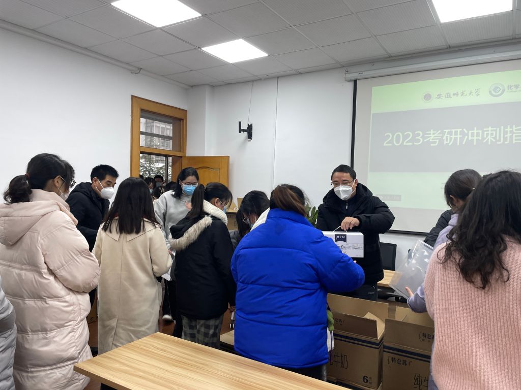 领导老师为考研学生代表发放了防疫包、考研文具包和牛奶等慰问品。