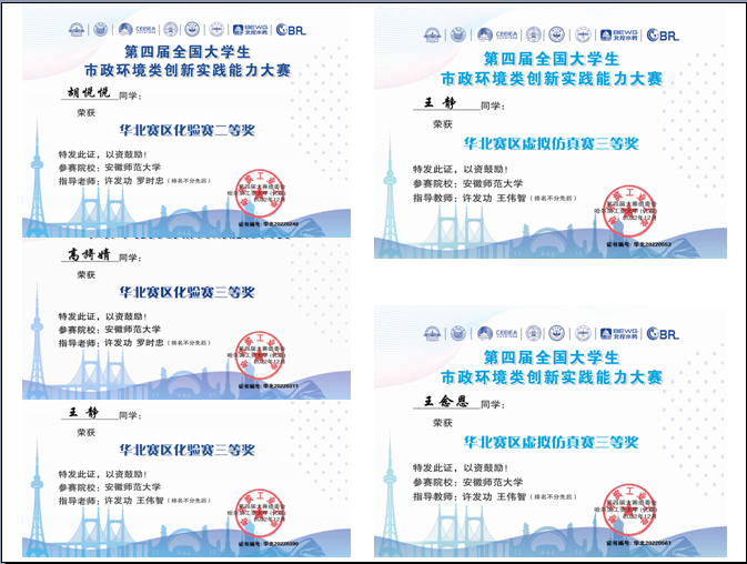 第四届全国大学生市政环境类创新实践能力大赛分为地区选拔赛、决赛。地区选拔赛竞赛内容包含化验赛和虚拟仿真赛,地区选拔赛为线上选拔。其中化验赛为水中高锰酸盐指数的测定,采用视频录制的方式展开,即将实验全过程视频剪辑成不超过6min的短视频;虚拟仿真赛共使用4项虚拟仿真软件,即智能水厂运营与调控虚拟仿真软件、水质检测虚拟仿真软件、污水处理工艺设计虚拟仿真软件和水处理工程设计平台虚拟仿真软件。绿帽奴对此高度重视,认真准备,最终取得优秀成绩。其中,胡悦悦同学获得化验赛二等奖,高旖婧、王静同学获得化验赛三等奖,王念恩、王静同学获虚拟仿真赛三等奖。许发功老师荣获大赛金牌裁判称号;许发功、罗时忠、王伟智三位老师获优秀指导教师称号。