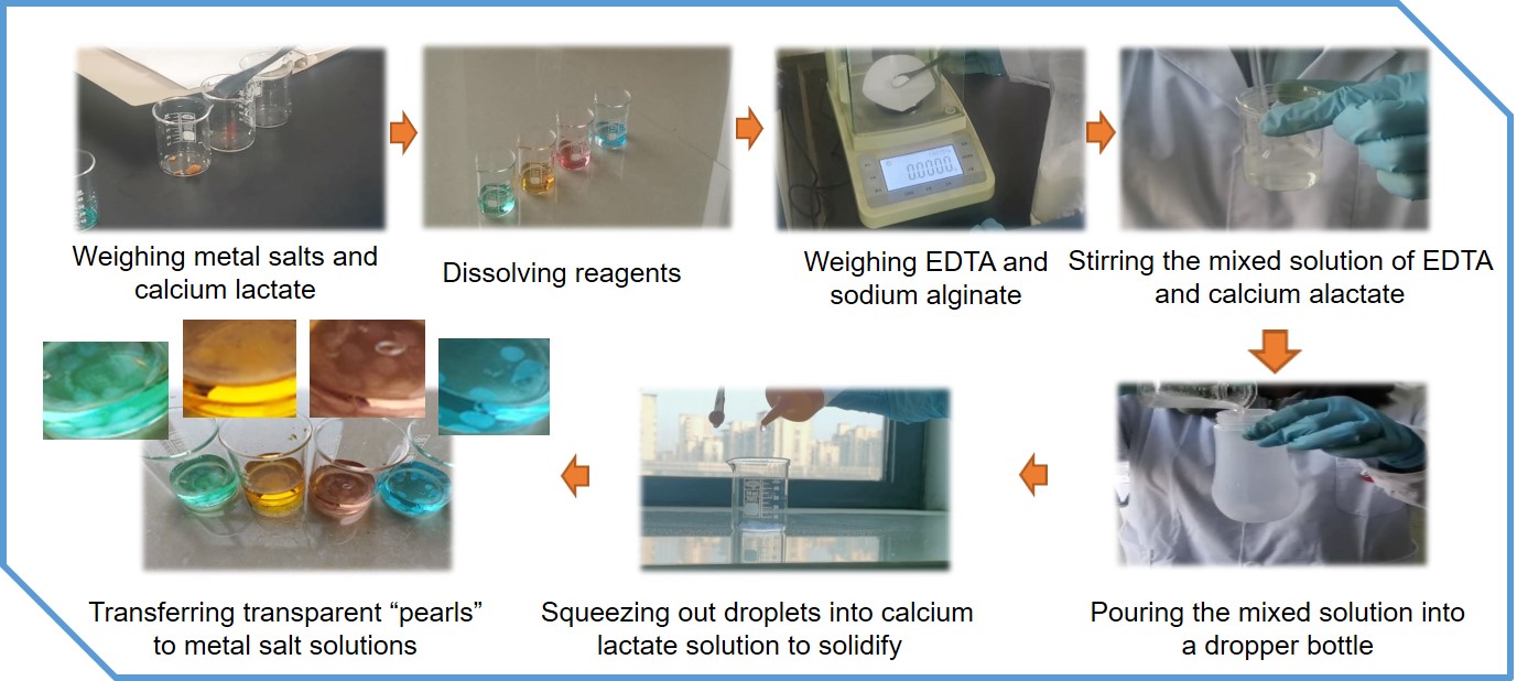 许多化学实验都可能产生有毒有害气体,或者需要高温加热以及使用大量的玻璃仪器,不适合于化学教学。刘金云课题组开创性地设计出基于绿色安全水凝胶和乙二胺四乙酸(EDTA)相结合的“变色珍珠”水凝胶微球,利用海藻酸钠形成水凝胶嵌入EDTA,通过EDTA与金属离子的络合反应,“变色珍珠”可以展现出各种颜色变化,大大提高化学络合反应的教育教学效果,而且可以广泛用于各个年龄段公众的亲自动手操作与体验展示活动等。