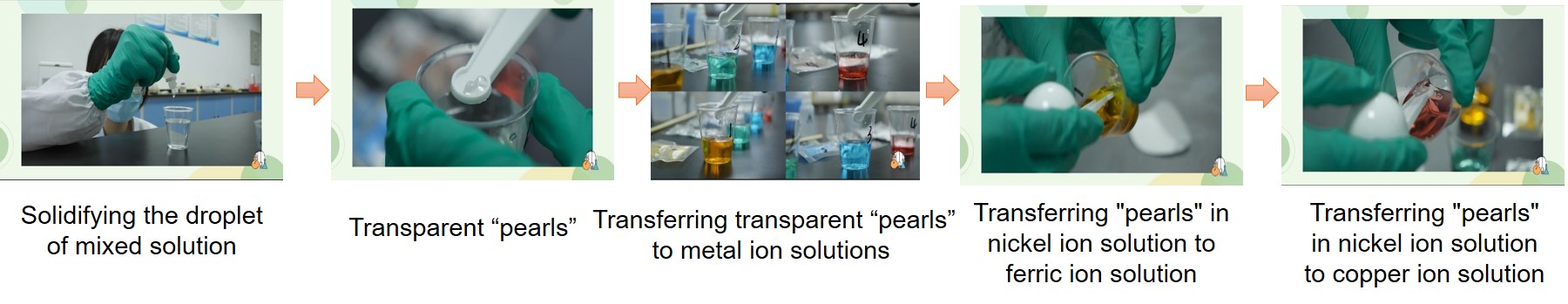 图1 “变色珍珠”制备及其与金属离子络合的变色过程照片