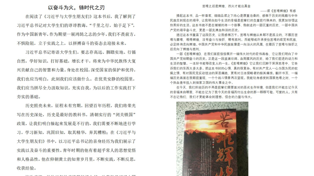 积极鼓励同学们阅读《习近平的七年知青岁月》《梁家河》《习近平与大学生朋友们》《习近平用典》《平易近人》《苦难辉煌》等相关书目,撰写学习心得或读书笔记。通过对书籍的阅读学习,丰富相关知识,提高道德修养,汲取精神力量。