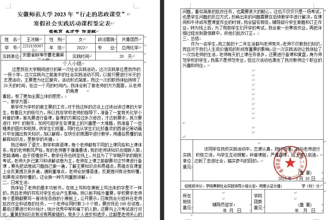 体验百变职业,领会生活百态。结合专业特点,同学们投身于职场,体验工作。王冰娴同学在家乡一所小学进行职场体验,在学校老师的指导下,她积极备课,多次修改教学方案,保证PPT能够吸引学生的兴趣,最终成功地展开了一堂化学知识科普课。与王冰娴同学一样,其他同学也积极参与家乡学校学生辅导、课程体验,帮科任老师分担批改作业和试卷的任务,激发了同学们对教师职业的向往,也达到了寒假实践课走进社会,踏实参与的目的。