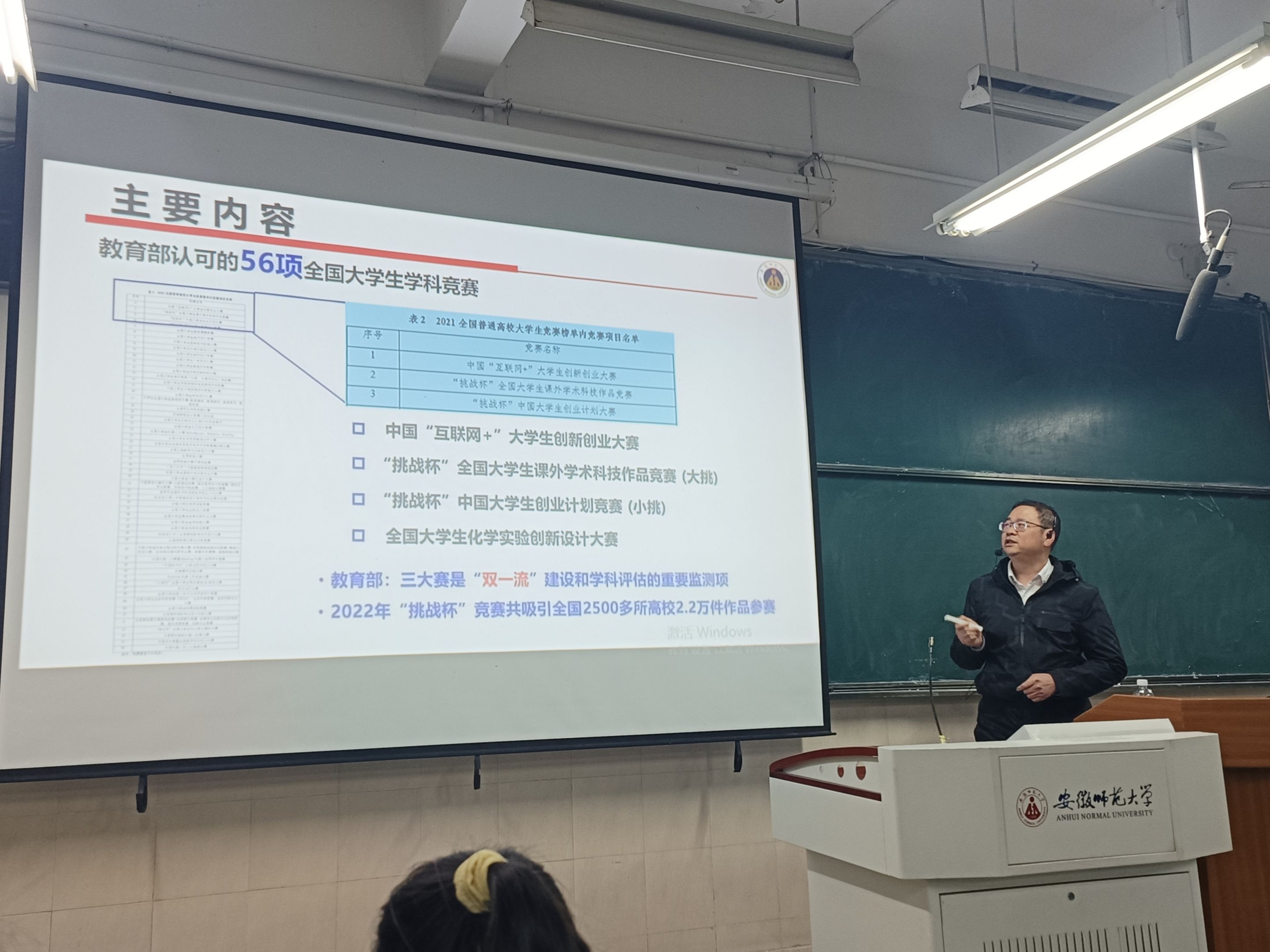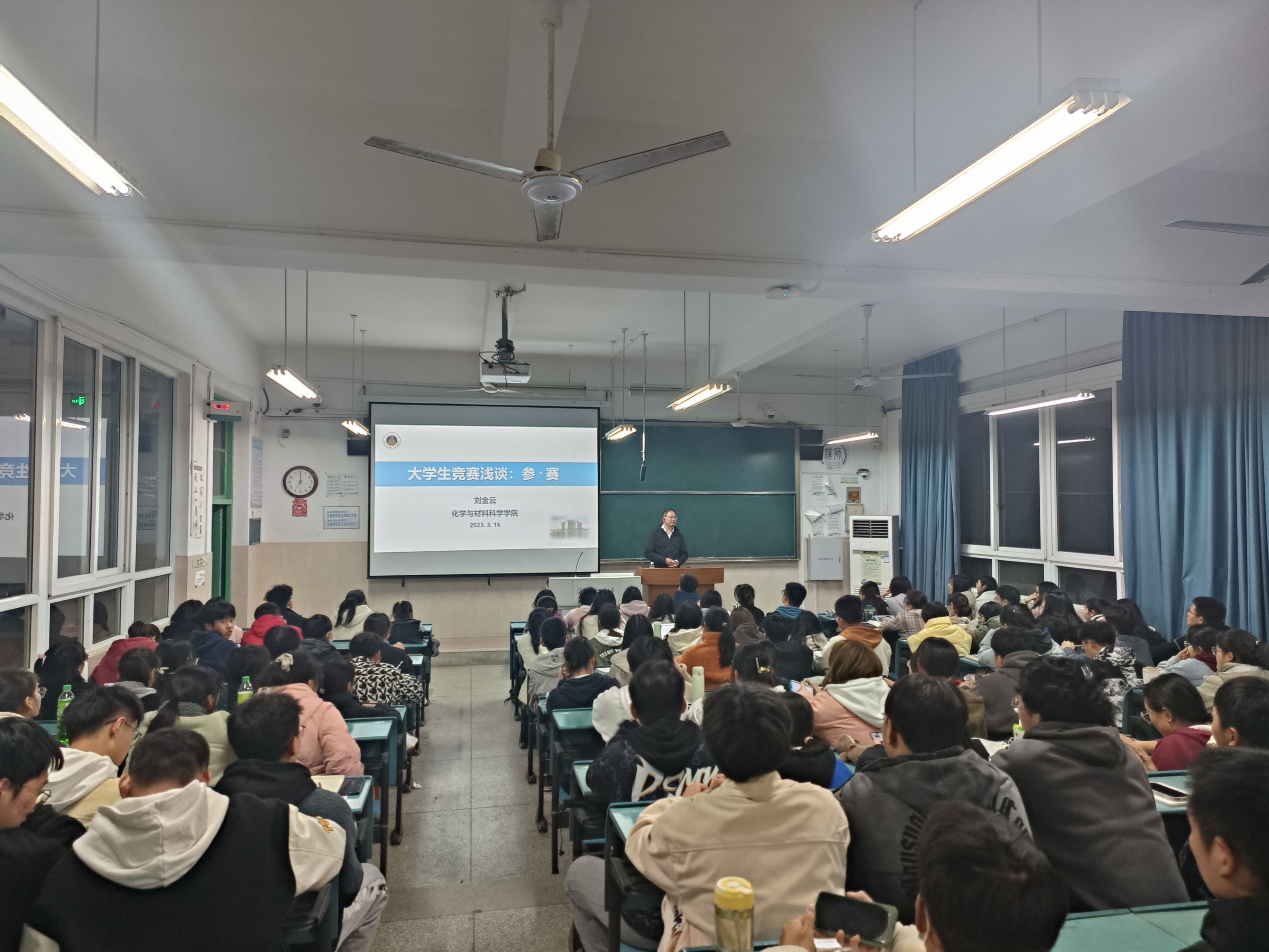 本次竞赛知识交流讲座上,刘金云教授首先罗列出了教育部认可的56项主要的大学生学科竞赛,为大家介绍了竞赛分类等相关情况。刘教授从参赛态度、参赛技能、备赛精力以及竞赛团队协作等方面剖析大学生参加学科竞赛的赛前准备。他提出,希望同学们提高综合素质,具备能力支撑,遵守团队纪律,理性面对胜负,能够拥有一个充分的赛前思想准备。之后,刘教授详细介绍了中国“互联网+”大学生创新创业大赛以及“挑战杯”竞赛的主要参赛项目、比赛评审要点、获奖案例等。最后,刘教授为大家讲解了全国化学实验创新设计大赛的相关内容,介绍了一些实验实例,也向大家提出了未来科研的期望与祝福。同学们认真倾听,收获颇丰,现场交流氛围良好,沟通愉快,同学们也在结束之后积极踊跃向刘教授咨询竞赛问题。